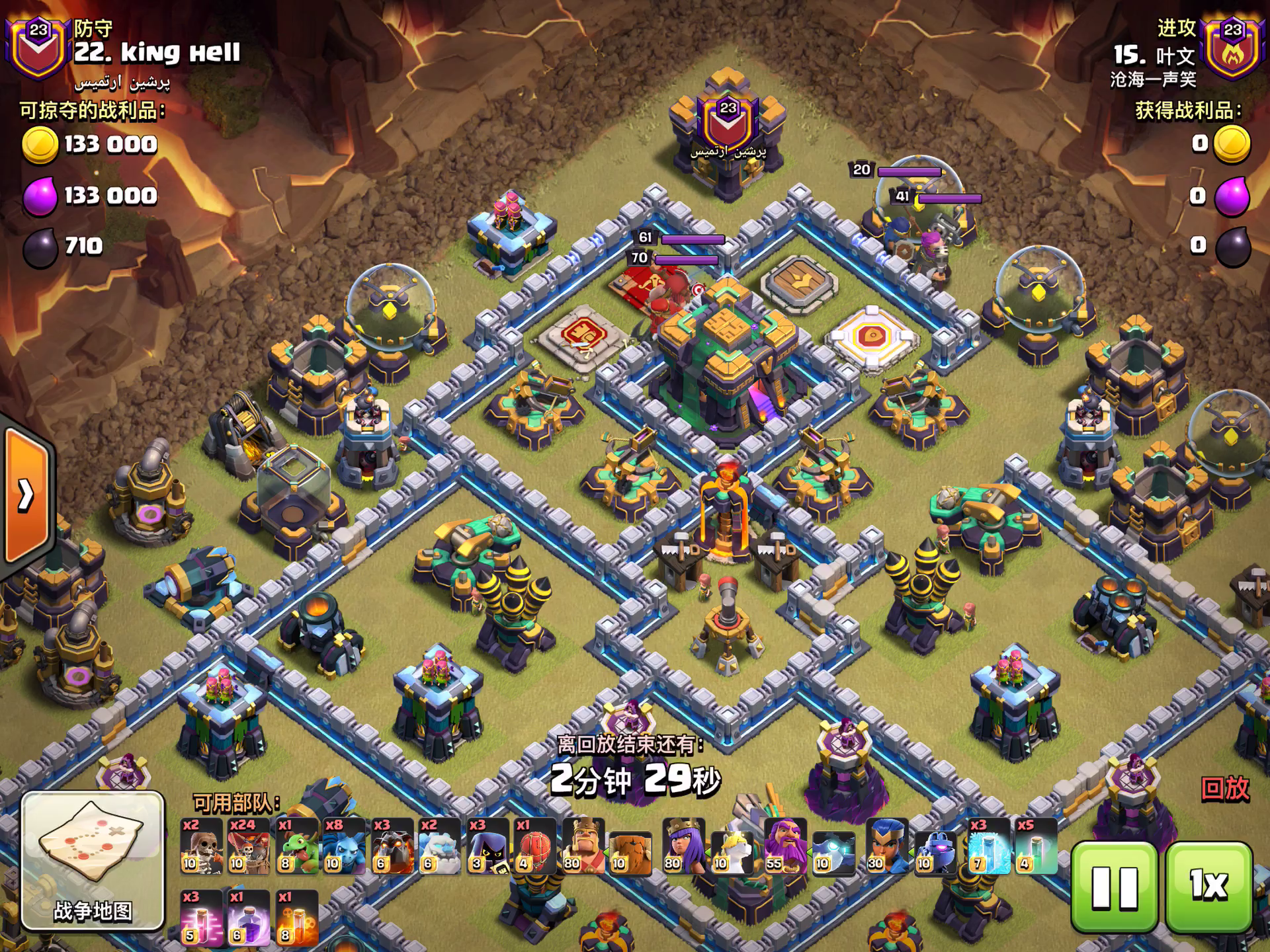 好久没单场6星了,这次进攻0失误,打得很满意。 飞艇隐身超法爆本,把援军、投石炮、防空……也给带走了,双王进一步阵型切割,超龙没有一字划,而是点放,在侧面点两只,防止走偏,盾神6点方向进场,法师断边,再次控好超龙走位,最后让了个技能和冰冻。