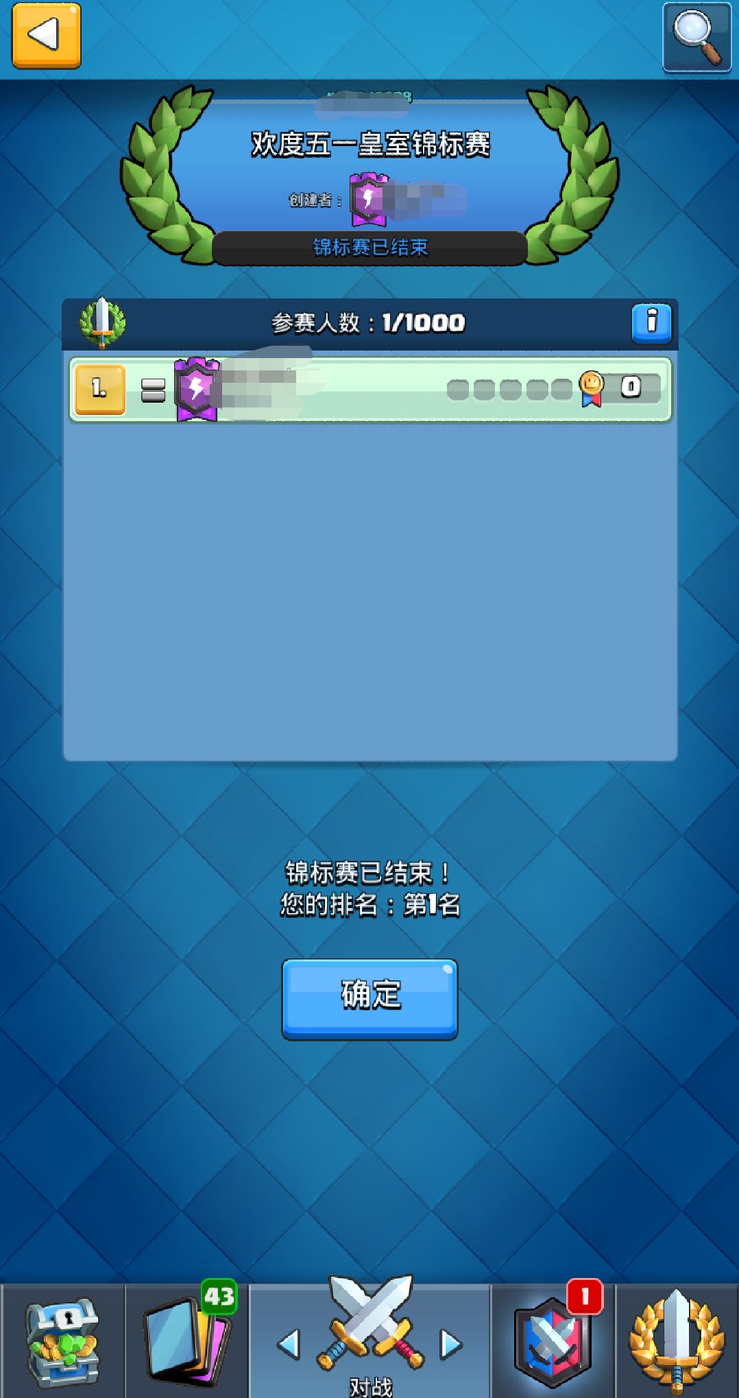 小长假五一劳动节来临,不知道五一大家都会怎么度过?小编当然是畅游在皇室竞技场,领略各阶竞技场的无限魅力与风光。当然如果你也愿意和我一起畅游,那么非常欢迎你加入我的欢度五一皇室锦标赛吧。欢迎TapTap皇室战争版内小伙伴参加!还有奖励拿哦! 活动主题:欢度五一,畅游皇室竞技场 活动详情 活动时间: 2019年5月1日晚上8点整开始,9点整开赛。 房间名:欢度五一皇室锦标赛 房间密码:二楼(锦标赛标签