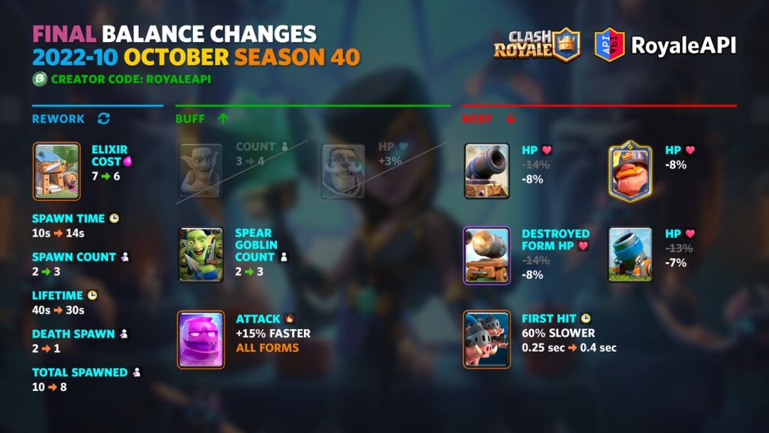 【】 移除哥布林和骑士的调整。对于加农炮,加农炮战车和迫击炮的削弱力度减小。 根据大家的反馈,Supercell确定了10月的平衡性调整。 以下是与初稿相比的变化: 移除了哥布林和骑士的调整。由于客户端更新时出现了问题,这些调整被暂时移除。未来修复问题后仍然会上线。 加农炮,加农炮战车和迫击炮的生命值削弱力度大幅度减小。 我们发现加农炮的强势很大程度上取决于英雄卡与小费的速转搭配,没有带上英雄卡的