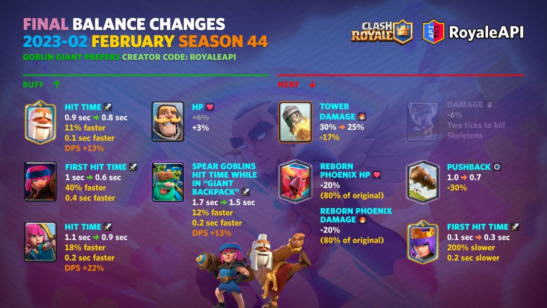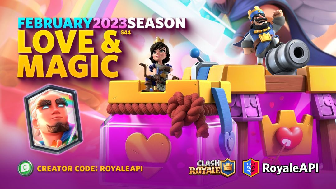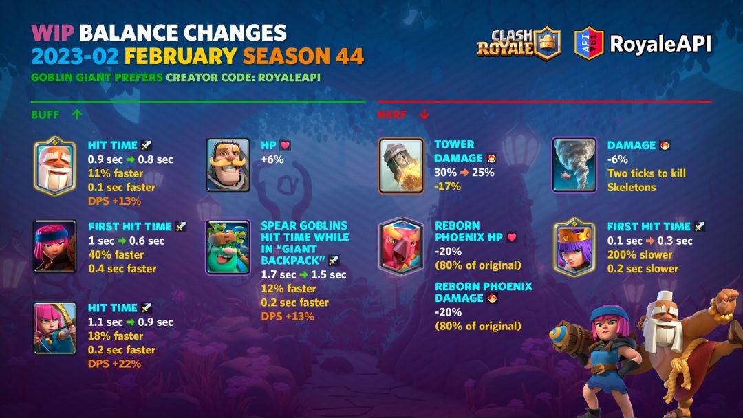 这个赛季有3张卡等强化卡牌,分别为神箭游侠,戈仑石人和电磁炮,每张卡牌都有相应的表情。而很多玩家心心念念的超级军队系列轮到了超级神箭游侠,完成相应挑战可以领取两个新表情。至于初来乍到的超大选卡挑战,本赛季将作为全球锦标赛的特殊模式。装饰物品更不会少,7个新表情,2个皇家塔皮肤,24个战旗装饰,应有尽有。 主题季第44季开始于2023年2月6日,星期一。 平衡性调整将于2023年2月7日,星期二实装