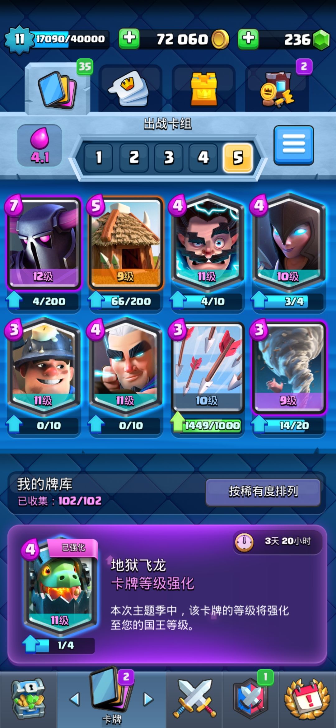 分享一套个人非常喜欢的自创卡组,经典12已在小号上通过。 皮卡,矿工为核心 茅房和矿工是十分优秀的抢血卡牌 电法配合房子防守会起到不错的效果 暗巫可攻可守,蝙蝠可以有效帮助皮卡清理杂毛,亡语蝙蝠可配合矿工进行进攻 矿工配合剑雨可以有效清理大部分后排,也可以为残血返场单位抗伤,给足压力 游侠配合飓风能起到很好的进攻和防守效果 单一飓风可以进行防守以及激活国王塔 大致思路是反打和消耗,不怕大部分主流卡组,除了(蓝胖冰球)和携带女巫婆婆的卡组。