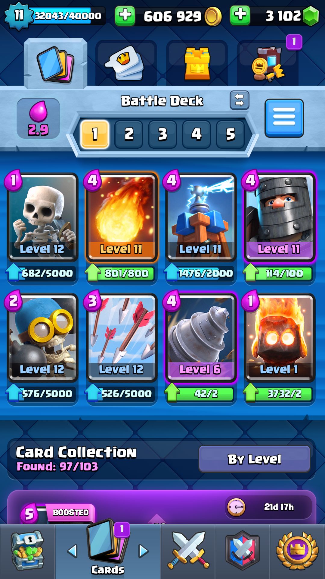 皇室战争 一直都是塔防类游戏中的顶尖存在,全球每年都会有大量的玩家加入这个大家庭。而这个游戏由于卡牌较多,养号太慢等多个原因导致萌新上手慢,走弯路,乱配卡组。导致卡等升的慢,杯数升级慢,被对手血虐间接流失了很多玩家。所以我想给皇室的萌新玩家更好的游戏体验,所以在这里出一个萌新攻略,方便新手快速掌握游戏技巧,少走弯路。 首先作为一个塔防游戏,想和别人公平对抗你需要相同的卡等和皇家塔等级。怎么样快速升
