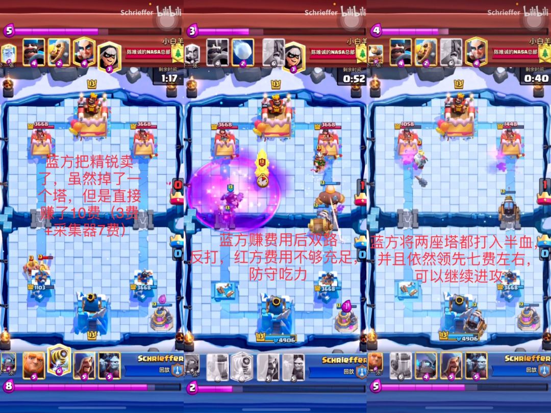 ,包括原视频的出处以及卡组 第三盘:对阵钻机 这个钻机可以用暗巫防,之后卡出一个水人来保护暗巫。解掉钻机的同时组织一波反打 (这波进攻跟上了婆婆,狂暴和奶豆,一分钟还没过去就推掉了半座塔) 暗巫防守钻机 (这里放错边了,不得不多交一个女巫婆婆来防守。其实没必要预判钻机位置,只要盯准钻机,到首次出兵的时间足够反应了。另外,女巫婆婆其实也能防守钻机,具体方法是卖第一个哥布林的伤害,再下女巫婆婆把第一个