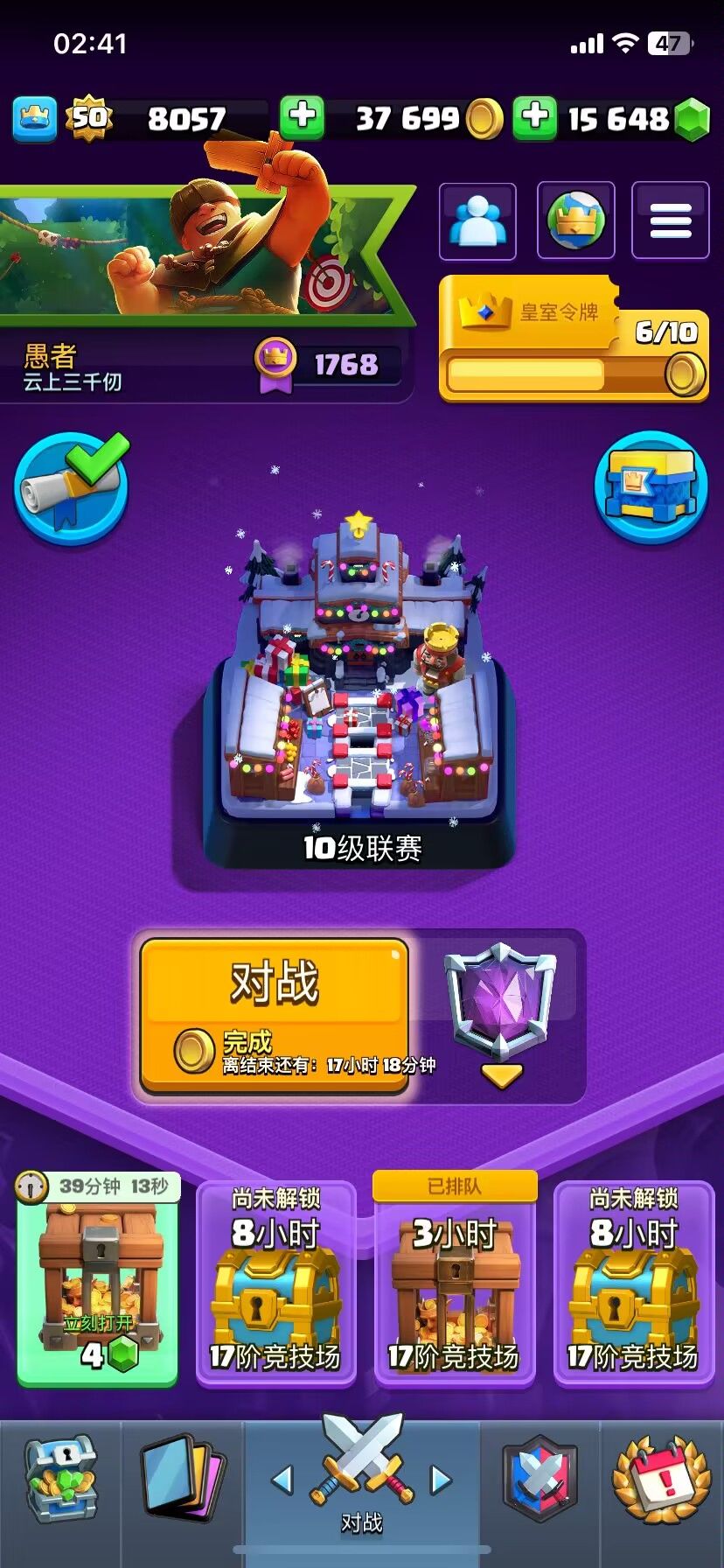 活动卡组推荐 本人亲测有效,4个号一共输了6场,大部分不是用此推荐打的 1-3阶:爱配啥配啥,为了保证胜率我2阶用的自闭火球,3阶用胖子攻城锤(无限算费无限开莽) 4阶:矿工、女武神、哥布林、火豆、剑雨、火球、地狱塔、炸弹兵 5阶:矿工、土炮、炸弹人、蝙蝠、牙签仔、女武神、火球万剑 6阶:1.矿工、投矛手、骑士、迫击炮、蝙蝠、火球、滚木、女枪 7阶:经典超骑蛋:超骑、炸弹人、矿工、蝙蝠、哥布林、女枪、王子、小闪 8阶:魔改火箭猪:野猪、滚木、冰豆、冰人、大闪、公主、小皮卡、小苍蝇 9阶:经典双王绿胖:绿胖、双王、小闪、火球、蝙蝠、团伙、投矛手 10阶:经典石魔改:石头人、铁苍蝇、大闪、飞龙、黑王、炸弹兵、万剑、小皮卡 11阶:经典杂毛车:电车、胖子、小皮卡、骷髅海、蝙蝠、大苍蝇、万剑、小闪 12阶:女巫胖墓黑王版:女巫、胖子、墓园、小苍蝇、黑王子、万剑、雪球、骷髅海 13阶:本人追求三冠用的三枪精锐:三枪、采集器、精锐、奶豆。刺客、幽灵、冰人、滚筒 如果追求稳可以采用下列: 1.皮卡锤(游侠锤)2.王子桶:王子、桶、绿林、吹箭、公主、滚木、火箭、盾骷髅 3.pedal套:精锐、钻机、炸弹人、游侠、公主、幽灵、刺客、卫队 14阶:地推车:狂暴、电车、绿胖、精锐、小闪、奶豆、黑王、电法 15阶:经典房水(这个阶的突然就送起来了所以可以冲9冠) 黄毛房、水人、天使、电龙、龙宝宝、奶豆、飓风、滚筒/万剑
