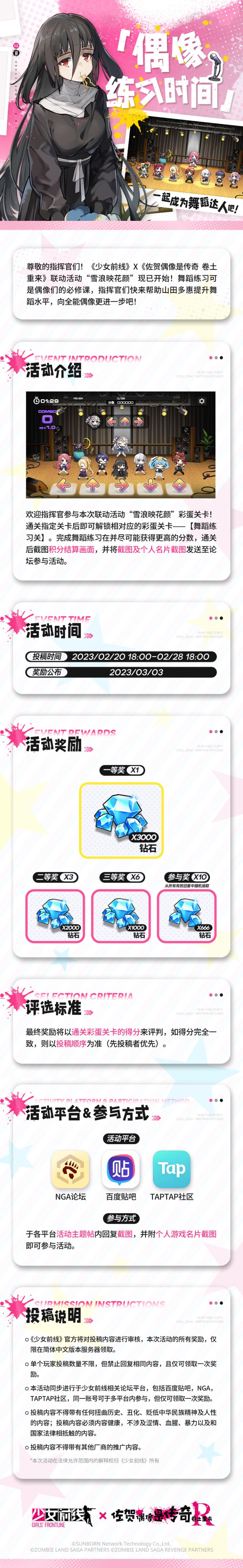 各位亲爱的指挥官!《少女前线》x《佐贺偶像是传奇 卷土重来》联动活动“雪浪映花颜”现已开始!本期将举办【偶像练习时间】活动。请各位指挥官于本贴内分享您的活动截图+个人名片截图,我们将选出共计20位符合条件位的指挥官送上活动好礼!赶紧行动起来,具体参与方式如下!#游戏福利