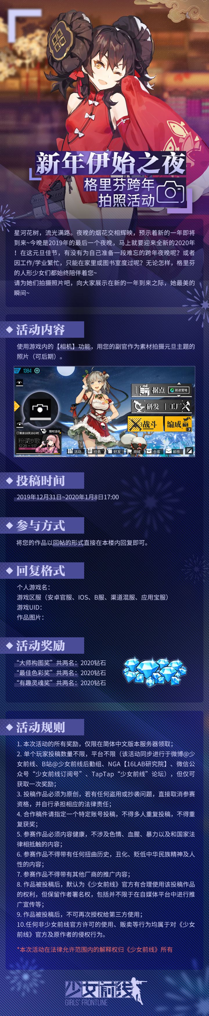 星河花树,流光满路。夜晚的烟花交相辉映,预示着新的一年即将到来。今晚是2019年的最后一个夜晚,感谢各位指挥官今年的陪伴!请用游戏内的【相机】功能,为陪伴您的人形少女拍摄照片,定格她在您的世界最美好的一幕吧!!即日起至2020年1月8日,在本帖下方回复所拍摄的照片即可投稿!注意在正文中标明渠道信息(安卓官网、iOS、B站、应用宝及其他渠道)、角色名和UID,欢迎附带文字说明或元旦祝福哦~我们