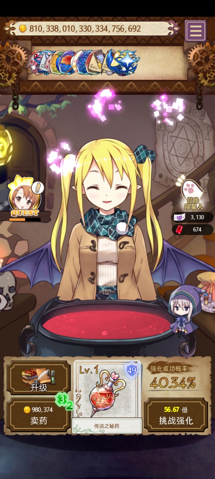 !入坑!终于是发现了这个游戏的玩法了属于是:叠甲(草(没看攻略自己琢磨出来的(居然花了三小时才想出来!(主要还是Pio太可爱了((()遇到甲就做任务,不是甲就滚去做委托((()这次运气不错,底价100k,叠了两次7甲最后还剩了4个最后卖了200m(累计金币才300m)体会到指数爆炸的乐趣 ✧(≖ ◡ ≖ )做和卖的药水这么多是因为正常过材料太慢了,材料一多就总是找不到自己想要的,于是随便扔一个材料进锅加快过牌速度(然后点歪!卖掉!点歪!卖掉!草!猫猫好拉啊,升级又贵扔材料又慢(恼