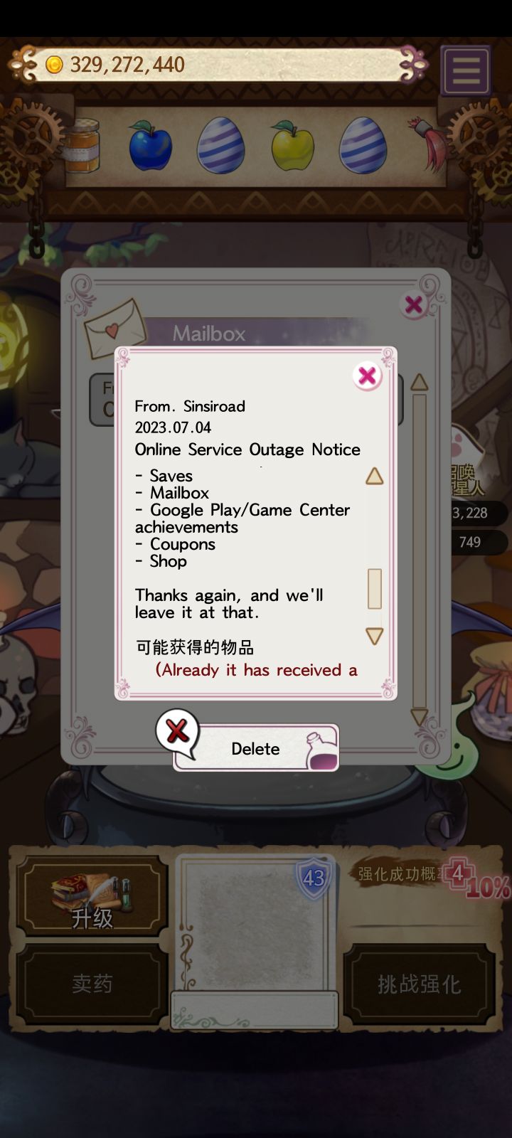 好久没玩了,我现在把他的名字给忘记了,所以我找了好久好久才找到,前段时间今天下载回来,然后给我发了一封信,是因为我还看不懂,所以我用软件翻译了,他是不是已经停服了,有点小难过,我知道我太感性了,虽然还能正常游玩,但是想到以前以前,心里还是有一点点不开心#药水制作师
