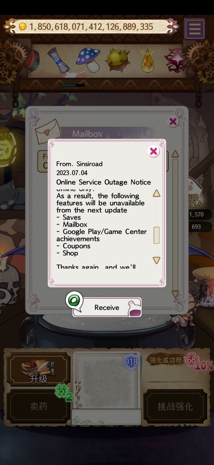 虽然sinsroad已经很久没有更新potion maker了,但他们在八年里一直在开着服务器供大家保存游戏。但由于服务器太昂贵,终于自今日起,potionmaker的服务器将被关闭,保存功能,邮箱,谷歌商店与成就都将关闭。这是最后的礼物。