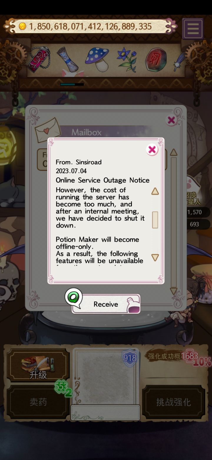 虽然sinsroad已经很久没有更新potion maker了,但他们在八年里一直在开着服务器供大家保存游戏。但由于服务器太昂贵,终于自今日起,potionmaker的服务器将被关闭,保存功能,邮箱,谷歌商店与成就都将关闭。这是最后的礼物。