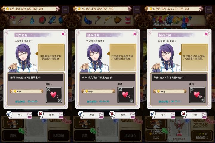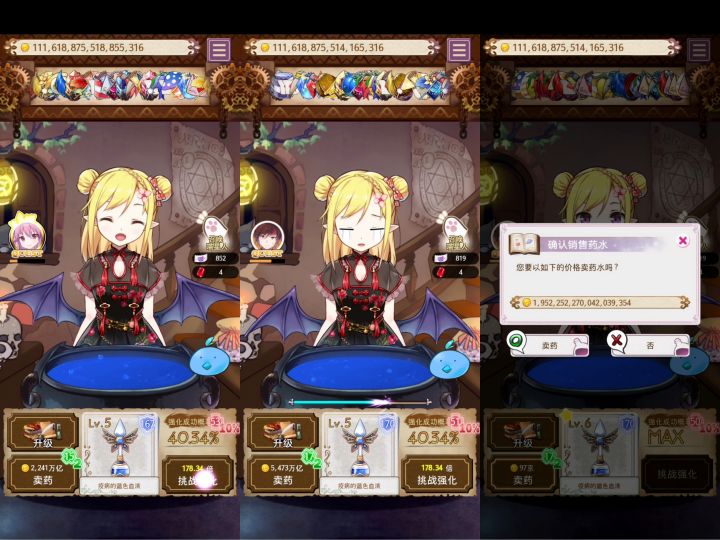 !入坑!终于是发现了这个游戏的玩法了属于是:叠甲(草(没看攻略自己琢磨出来的(居然花了三小时才想出来!(主要还是Pio太可爱了((()遇到甲就做任务,不是甲就滚去做委托((()这次运气不错,底价100k,叠了两次7甲最后还剩了4个最后卖了200m(累计金币才300m)体会到指数爆炸的乐趣 ✧(≖ ◡ ≖ )做和卖的药水这么多是因为正常过材料太慢了,材料一多就总是找不到自己想要的,于是随便扔一个材料进锅加快过牌速度(然后点歪!卖掉!点歪!卖掉!草!猫猫好拉啊,升级又贵扔材料又慢(恼