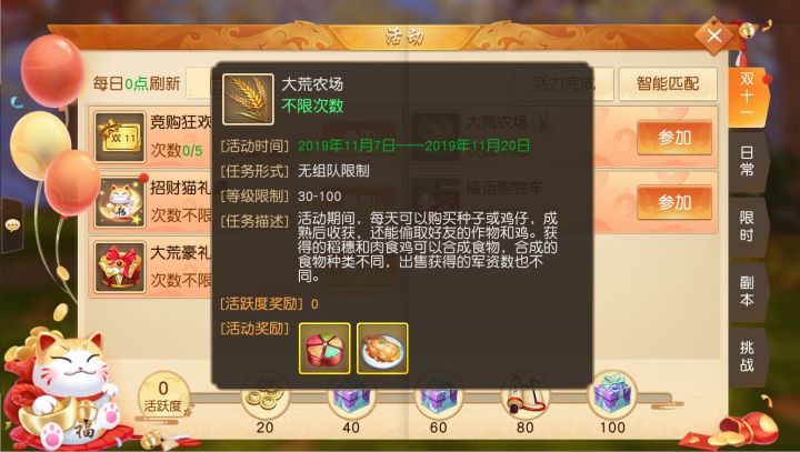 《天下》手游双十一活动情报前瞻!新设玩法“欢乐偷菜”,种麦穗、养鸡仔就可换海量军姿!单身狗“大乐”亦携海量红包现身,活动期间少侠不仅可得月钻、雷钻等奖品,还可带“大乐”同款“福运购物车”珍兽回家!每隔8小时还有“双十一豪礼”活动免费送宝箱,新服玩家更享三折特权!快来十一月新服“紫气东来”参与新服外观抽奖,7重成长福利与你相伴,玩转大荒就是现在!【左手农场,右手牧场,今天的你“农家乐”了吗?】《