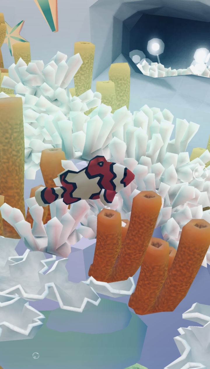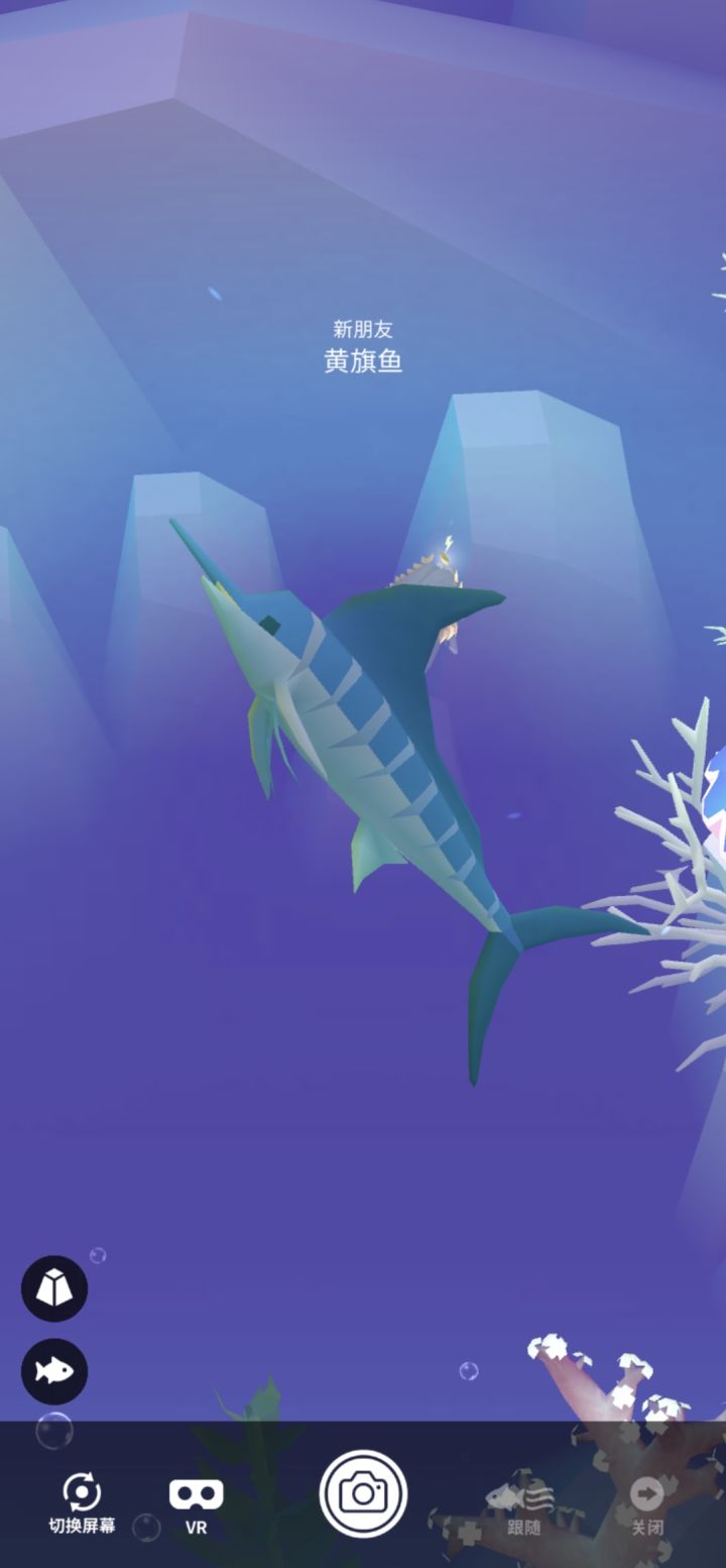 为了能更容易发现黄旗鱼,索性把鱼群都收了起来,留下只会在海葵附近活动的小丑鱼。上次记录是2月8日,时隔将近两月,今天黄旗鱼终于出现了。刚才正日常挂机中,偶尔看看手机屏幕,在不经意间看见一条蓝色背鳍白色肚皮的鱼正在飞快的游动,瞬间反应过来马上对焦拍照分享,就顺利解锁黄旗鱼啦。我遇到黄旗鱼过程是这样的:启动游戏后1.5h出现两条黄旗鱼。网上找的攻略里提到的启动游戏后半小时内有10%概率成群结队出现