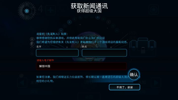 在玩过好长时间后我来分享一下自己的心得体会。游戏名叫先发制人,一定不是白起的,游戏一开始你就要做好最全面的发展,你有两种选择。一:选择摧毁核武,世界和平,这当然也是这个游戏想表达的意思,具有教育意义,值得人类思考。二:核战,先发制人。有附近的小国,一开始就选择摧毁,并迅速扩张版图,扩张完一个地方迅速造出拦截导弹,内部城市立即进行科研,研究洲际导弹,有了洲际导弹就去摧毁那些小国,千万不要拖沓。