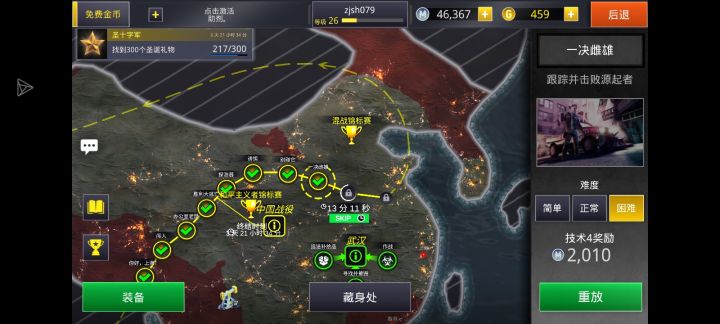 如图,想快速肝满500圣诞礼盒的,直接无脑刷中国地区任务一决雄雌即可,最好是手枪 + 机枪。