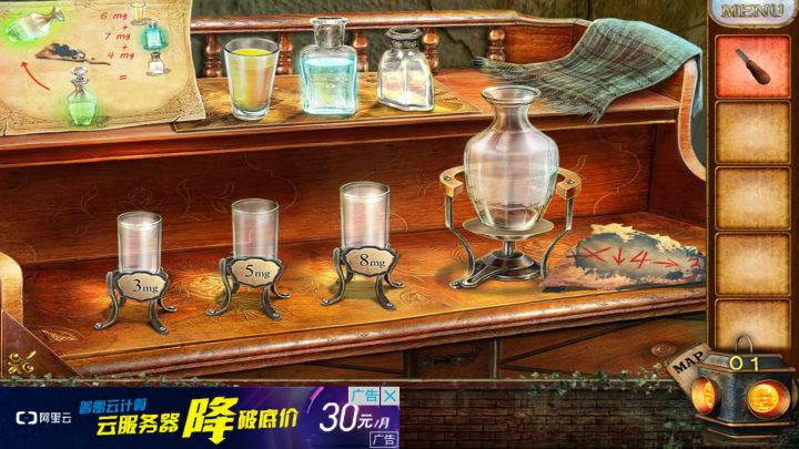 可能大家已经知道怎么解了,我算是来文字补充一下吧第一步,把黄色液体倒在3ml那,再把3ml倒到8ml那,重复一次,就得到6ml了第二步,把蓝色液体倒到5ml那,再把5ml倒进3ml,把5ml剩下的液体倒进8ml,这样就得到2ml,然后把3ml的液体倒进5ml,点蓝色瓶子把5ml的瓶子蓄满,把它倒进8ml里,就得到7ml。第三步,把白色液体倒进5ml,再把5ml倒进3ml,把剩下的液体倒进8m