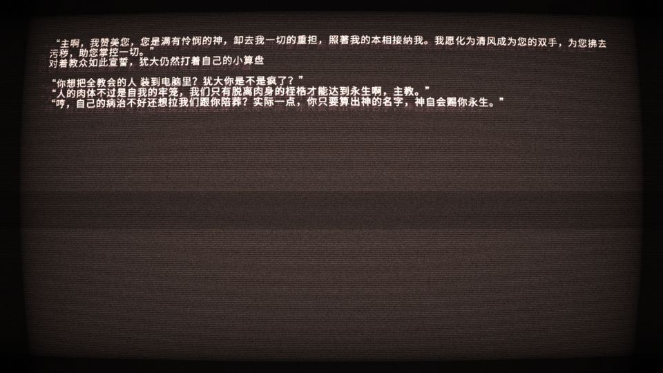 通关「艾希」, 并没有所谓的爽快感。仔细的想了半天,终于发现了问题所在:“这个故事到底在说什么?”仅仅是简单的“打败了犹大,拯救了人类“吗,我看未必,以下便是上网整理的剧情内容,配合游戏插图,自行理解吧 ●游戏背景犹大是教团的主教。犹大病的很重,在外人看来他渴望着永生,所以当时打算将所有人都装进了电脑里面,因此不少人反对。但是永生真的是犹大所希望的吗?他的提议一直不被实验者们认可,直到他找到了死灵