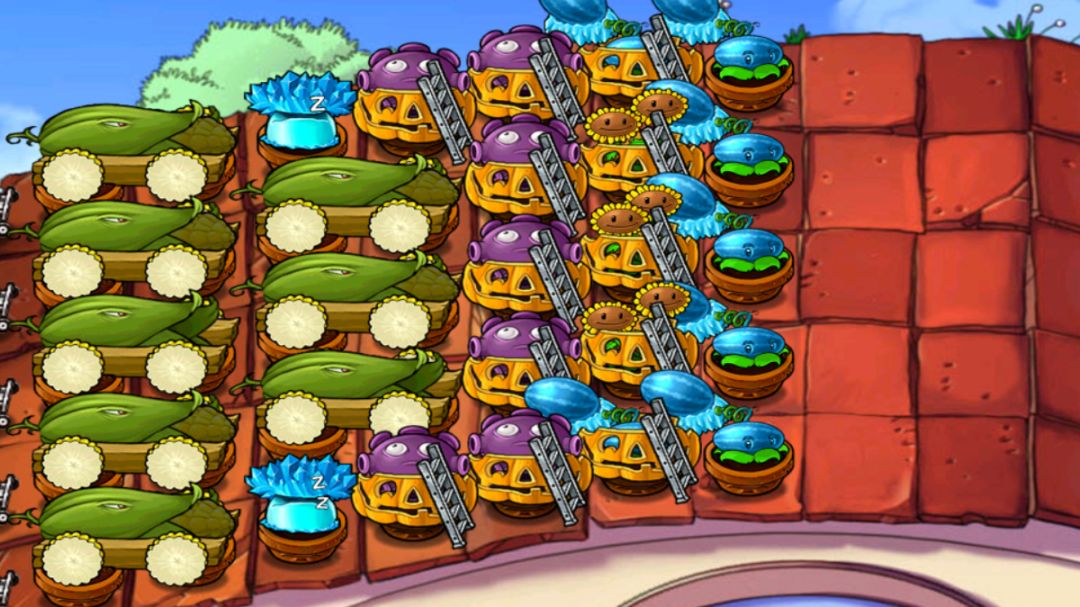 北美版本因为巨人肾虚扔不远,使得非超多炮阵的前置炮几乎无法存活。然而反向思考的话会发现,这一特性使在后排摆放前置炮成为可能,规划以八炮ch6节奏构建阵型,遂成此阵。 节奏ch6:|I-P|P|(11|7)跑落地后顿一下用冰以冻住后场小鬼们。冰菇开场防冰瓜反应慢。小偷锤杀。樱桃w9炸中三路催红眼扔小鬼,此外遇刷新延迟也可用以激活刷新。三花用以应对可能的炮损,所以别砍。