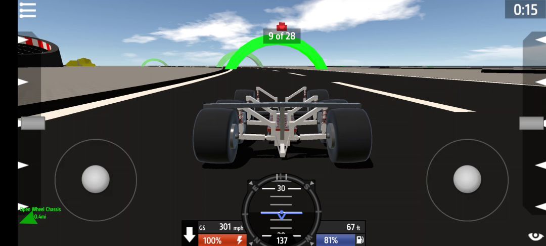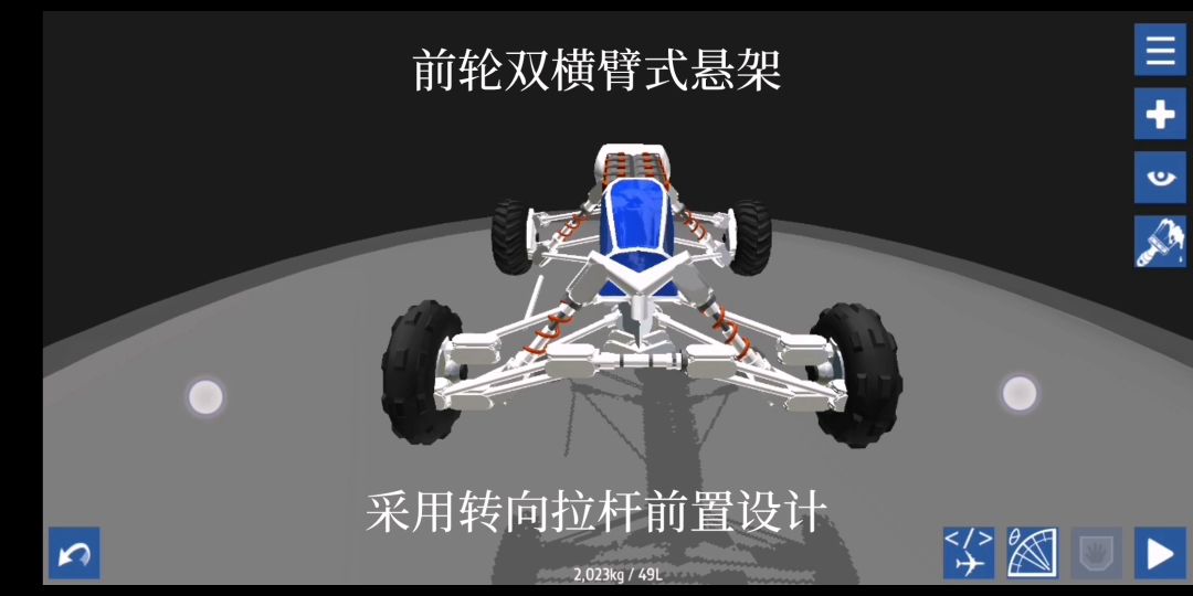 前双横臂悬架,后双连杆拖曳臂悬架,行程前悬小于后悬 采用前置转向拉杆,由一个活塞驱动转向拉杆 前轮做了主销内倾、后倾,还有阿克曼转向几何 后轮没什么特别的,没做传动轴,如果游戏有无限转轴的话还能用转轴通过传动轴驱动后轮,因为万向节在游戏里是可行的 球绞采用两个hinge rotator加一个转轴制成 后面驼的罐子是油箱,车身太小了,只能装7升油