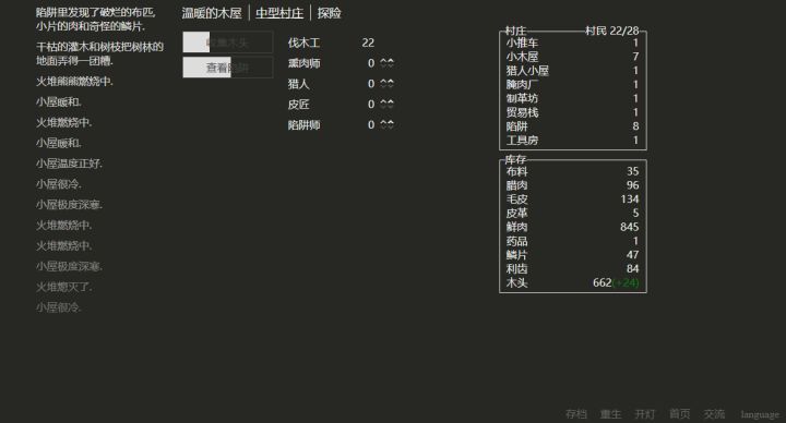 这个游戏也算是一个老游戏了,原版是国外的,然后我这边主要玩的是汉化版的游戏,非常简单,就是一个纯网页的文字游戏,所以很适合上班摸鱼,开个网页弄成小窗就可以美美开玩,有挂机和探险元素汉化版相对于原版剧情较少,所以刚上手会有一些懵,不知道要怎么玩开局,其实就是你出生在一个小屋里,屋子里只有你,几块柴火。你要点燃柴火照明温暖自己,柴火不够了你要去搜集柴火,后续柴火多了可以再建屋子,有了屋子就会有人。也