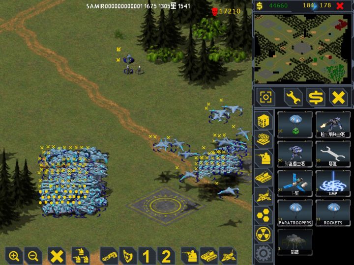首先没海军,因为这是初期所以没事,不过平衡性问题太大,大苏维埃碾压一切,几艘基洛夫打到你出屎,除了拿那个电磁脉冲不然数量一多基本无解。例外空军有点强,多数坦克不对空,一般只能靠建筑。但建筑要有电,你假若就差1的电所有建筑都不动,贼蛋疼,对面飞机打你几个发电站你基本gg除非真的出了很多打炮的小兵不然就没救了。( 说完这些发个pvp的图和一个我国的吊打老外)