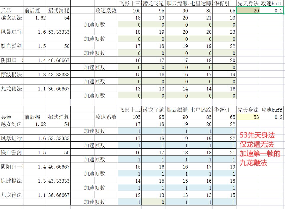 天下武功,唯快不破,这里推荐高性价比身法加点,适用主流兵器武学 第一种方案: 先天身法大于等于53,可以突破几乎所有主流兵器武学的第一帧加速 第二种方案: 先天身法大于等于66,首先可以突破近乎所有主流兵器武学的第一帧加速,还能突破一小部分的第二帧加速 第三种方案: 先天身法大于等于94,能够突破大部分的第二帧加速,还能突破小部分的第三帧加速