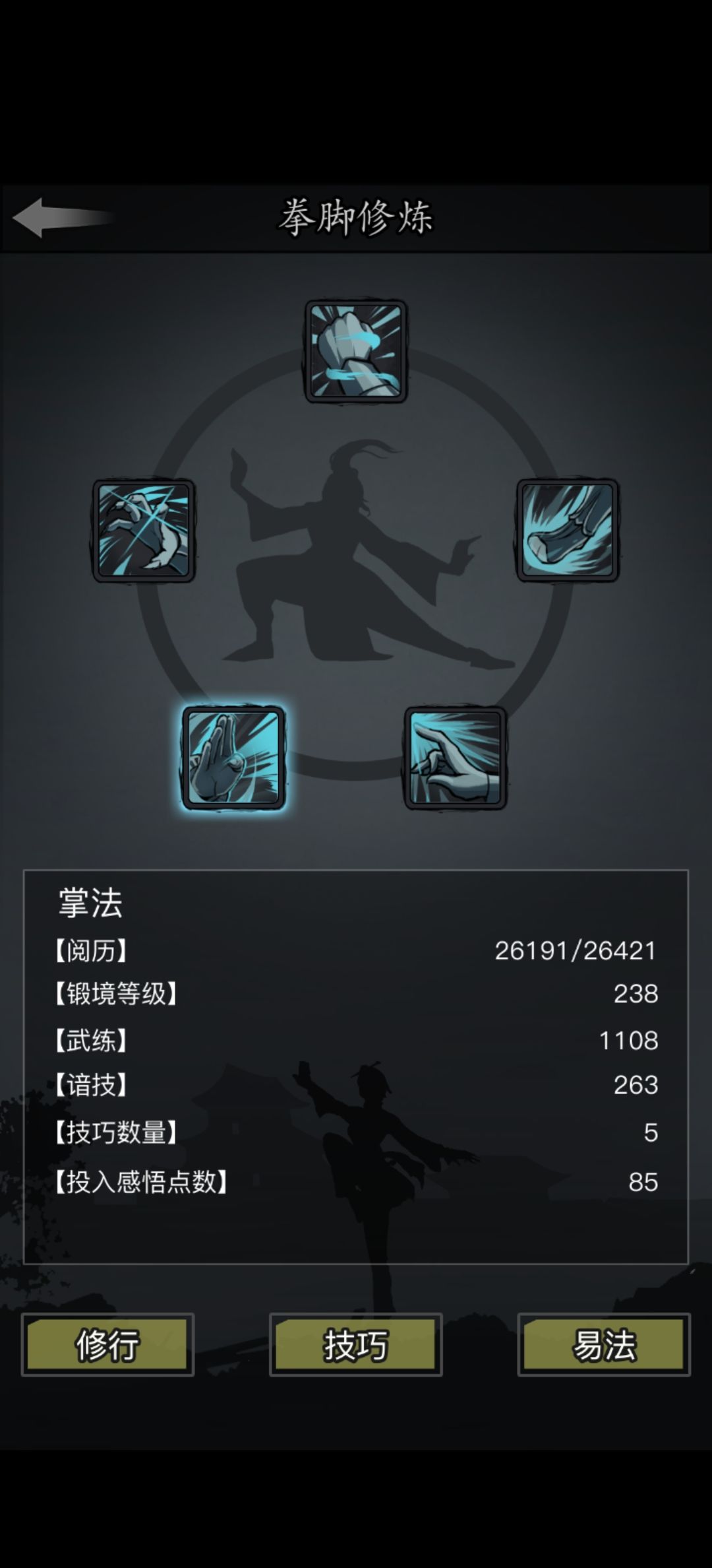 拳脚系统也出了好几个月了,小猴是没什么攻略发出来,只能咱们自己摸索了。 关于技巧修炼,需要修行‘潜思经验’来获取‘感悟点数’(感悟点数五法通用),拳腿指掌爪五法的技巧分开,点击对应的‘技巧’即可修炼对应技法的技巧。 进去了有10个小方块,每个小方块点击下面的‘技巧修炼’可投入n(1∽5)个感悟点数升入下一级,小方块最高10级(橙色的没升过不知道),小方块级数越高谙技越多(1级对应4谙技,6级对应2