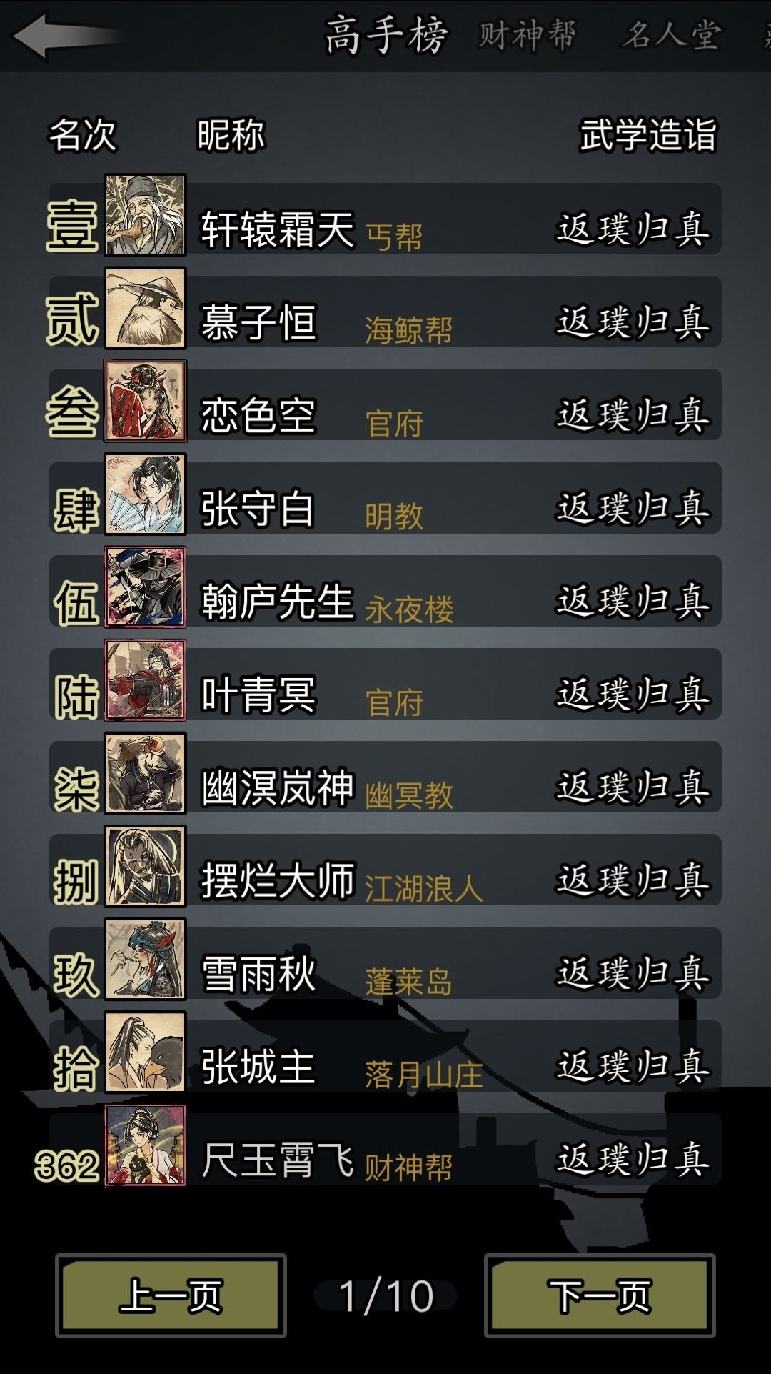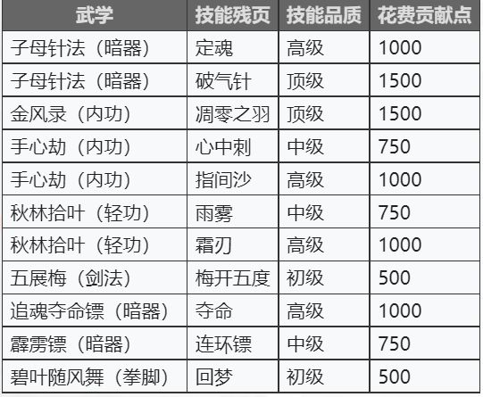 放置江湖官方攻略组: 作者:唐墨麟 编辑:一爱扯淡的蛋 目录: 一,师门补充 二,习武指导「低转」 三,套路总汇「五转」 四,推荐加点「五转」 五,神兵方面「暗器」 六,经脉推荐 七,武学介绍 一,师门补充。 师门残页商人: 师门商人可购买的装备: 师门地图内同门(玩家)送礼: 送礼正确物品:师门声望+20 送礼错误选项:师门声望+5 切磋胜利后:师门声望+10 二,习武指导【低转】。 0—4转武