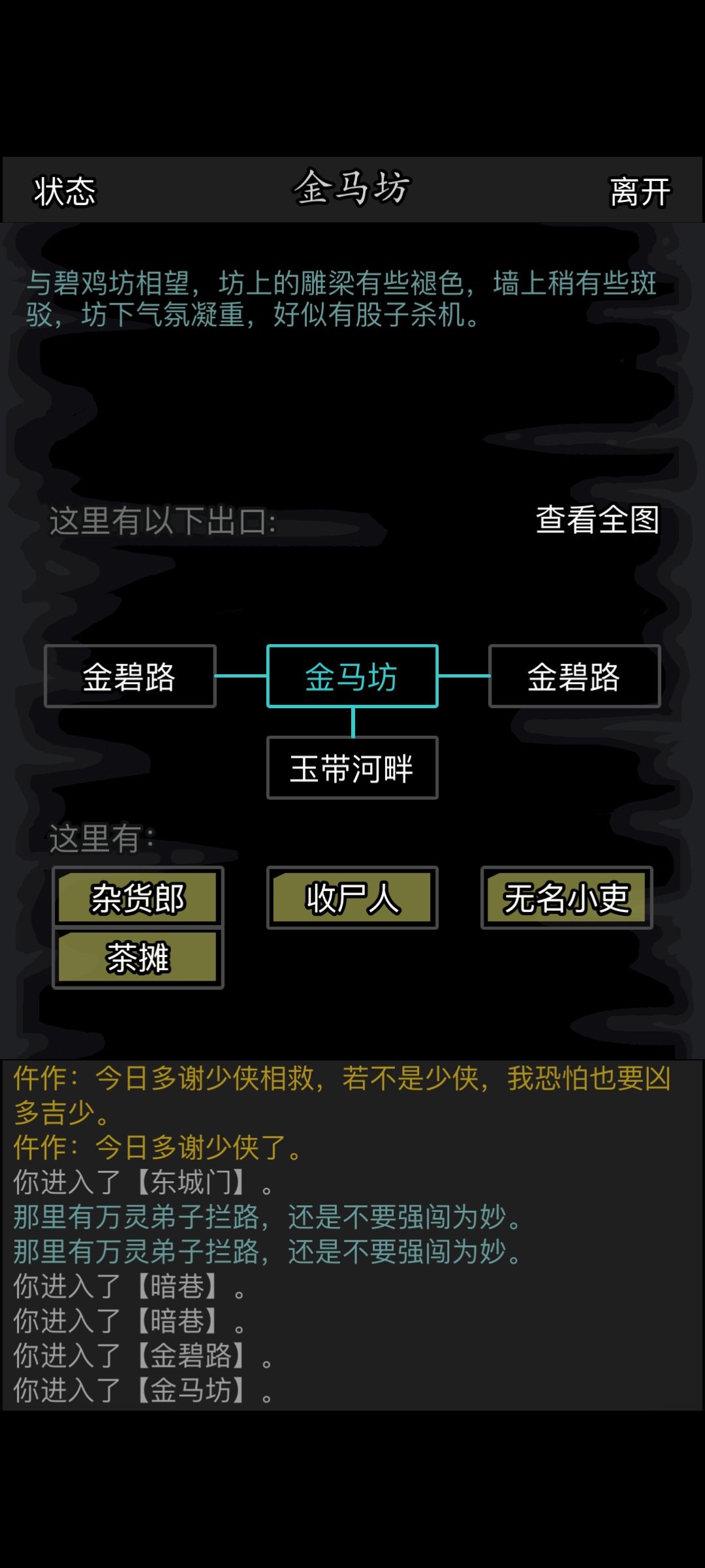 #放置江湖破妄前行 以下是根据曾玲玲版本优化的最少操作 路线优点:避开无限偏转李胜贤,没有百分之10伤害的毒buff,最后的boss少两个小怪 --------------------流程攻略---------------- 【城外官道】-【东城门】 东城门:【交谈】何歧 【东城门】-【金碧路】-【北大街】-【客栈前院】 客栈前院:【询问】何歧 【客栈前院】-【北大街】 北大街:【战斗】万灵弟子