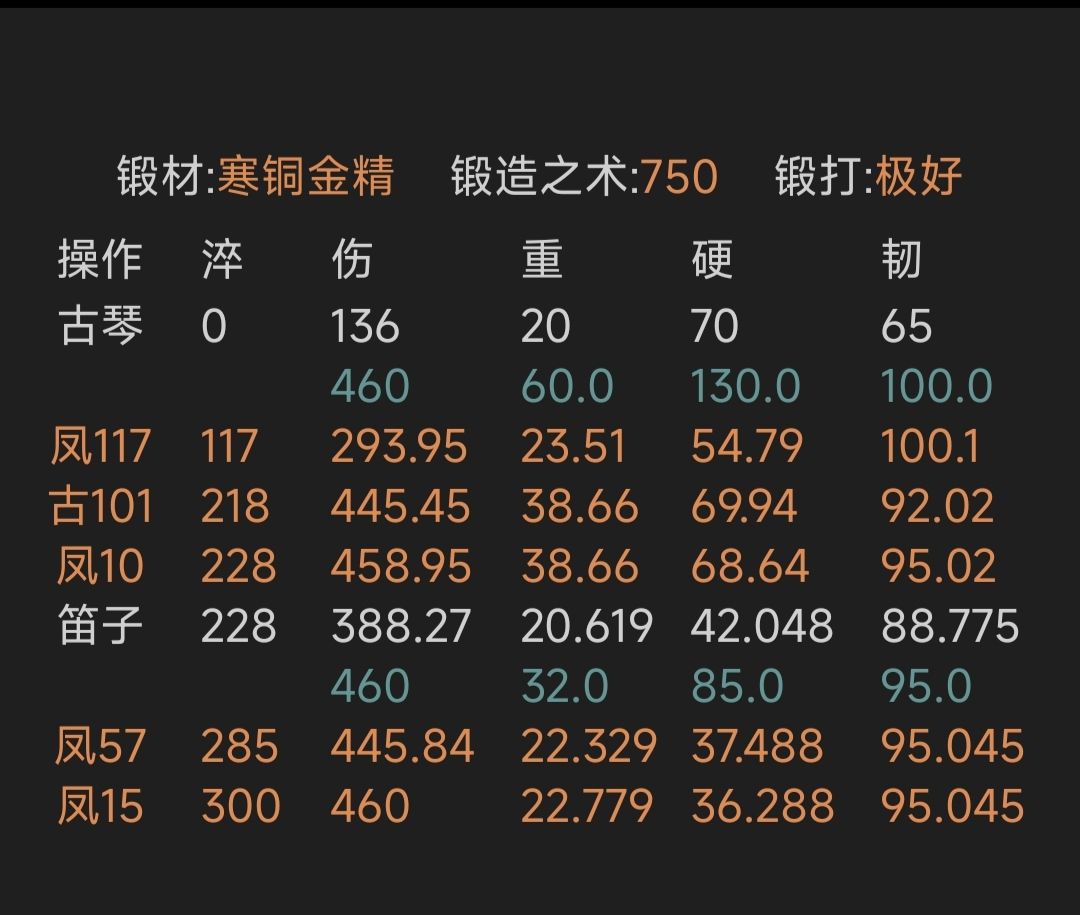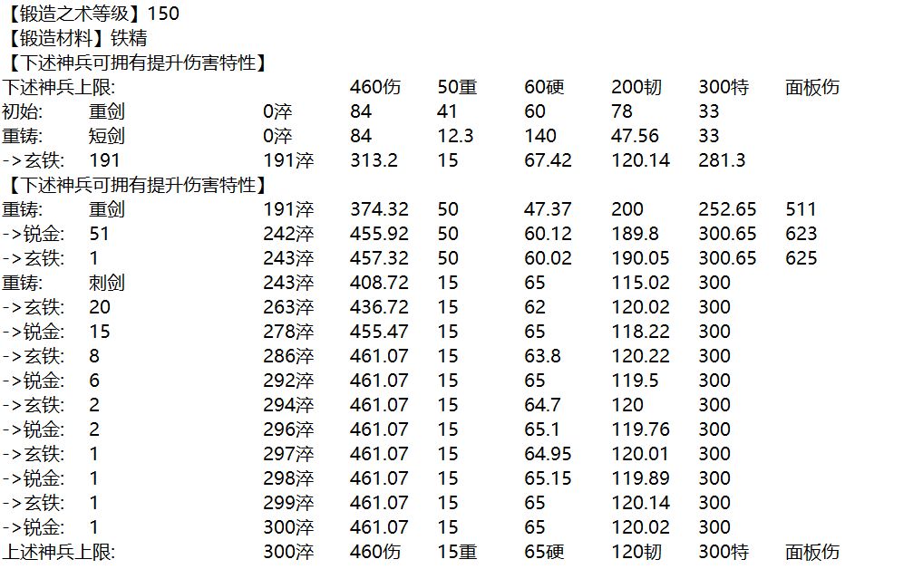 玩了两节毛概课的剑庐也没玩明白这b玩意儿 影响因素太多导致数据庞大 烦 提升了一点重量,以及最低所要求的锻造等级 适用于五锤子没干出来极好上限70韧 范围为65韧–70韧各自对应最低锻造等级 如果不到等级那么初始伤害不够将满不了伤 自己对号入座吧 边打边写中发现其实23重也能打出来 试了试65韧性,打不出来23重 其他没试 累死了 要在重铸前用古补伤害和重量 得控制数量达到满伤满韧 还得尽量压低锻