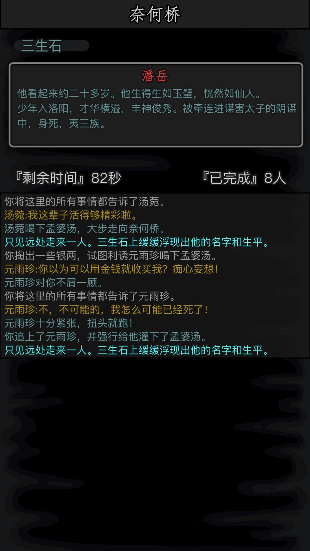 奈何桥最大收益需要让18人喝汤,一般来说手机不卡也就能经过20多人。现在我把我的经验总结一下,还请各位大佬帮忙完善。 一、固定答案的 1.历史名人类 嵇康,上官婉儿,李师师,李清照还有华佗是好言相劝; 秦桧是威逼; 其他人都是坦诚相告。 2.其他坦诚相告 七十多岁高僧,出生檀香满室,自主坐化的; 苦读成为父母官造福一方的; 丐帮好汉; 武当大侠; 桃李天下的夫子; 落水风寒而死的信差; 黄河水鬼害