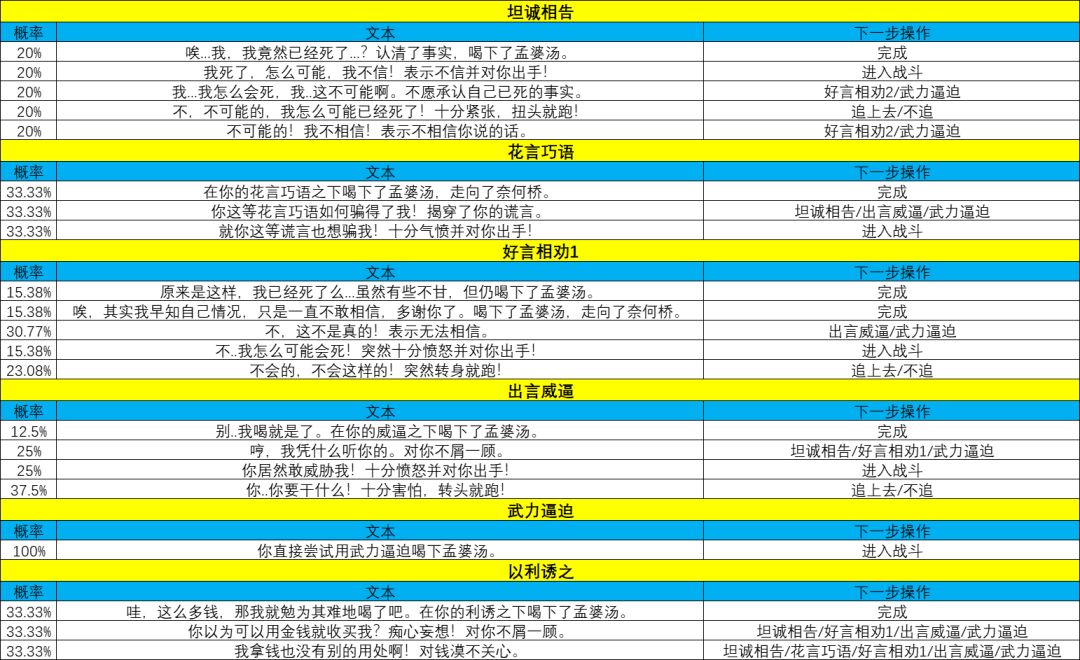 攻略负责人:杨依霜、绯村毛玉 【任务机制】 开始任务后,从所有人物模板中随机选择一个,生成对应人物。 初始有【坦诚相告】【花言巧语】【好言相劝】【出言威逼】【武力逼迫】【以利诱之】六种选项。 某些人物模板有完美选项,选择对应的完美选项必定会成功(完成)。 详细人物模板见【人物模板】页。 如果当前人物没有完美选项,则会根据选择的不同选项,按概率得到下一步结果。 初始六种选项的结果如下: 如果进入战斗