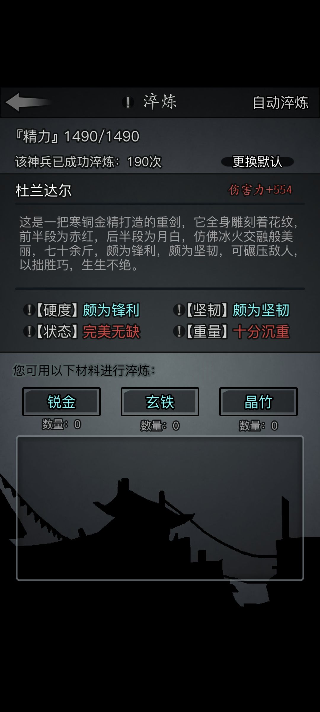 准备工作:百锻残篇·剑*1,西洋兵录三*1,锻造之术150级,读书写字150级,基础拳脚400级,内力12000,铁精*1,古木碳*5,云香碳*4,遁地符*10,元宝2200(2400) 铁精:10章铁匠50碎银买短刀,38章连续熔炼3次 胚子:玄兵古洞铁精锻造重剑,放入5古木碳4云香碳10遁地符点内力10次,5%概率出极好,要求硬度>60韧性≥78 淬炼:18章华山云台峰摇动华山松攀爬至洞穴,找