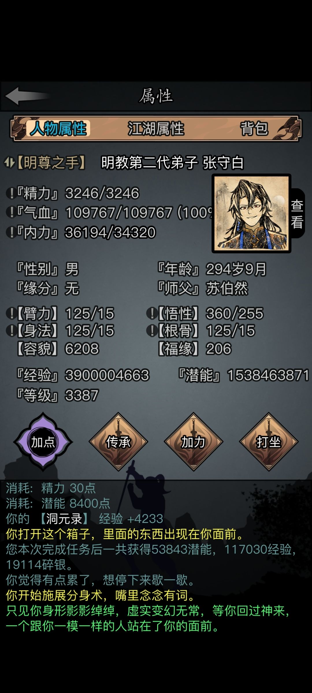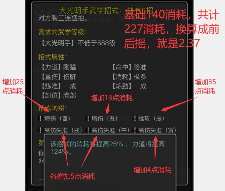 11月12日更新了:调整经脉天赋的互搏神通互备拳脚的伤害计算方式,战斗中用自创神功作为互备拳脚进行战斗时,其气血伤害和气血上限伤害会受到修正 来自大佬依霜的数据为: 1.自创所有模板都是0.1招式前摇、140初始消耗起步的(初始消耗≠招式消耗,仅用于换算招式后摇,也就是1.4的招式后摇,加上前摇刚好1.5前后摇) 2.自创修正系数 = 0.2 + min(主手招式消耗体力/副手招式消耗体力, 1)