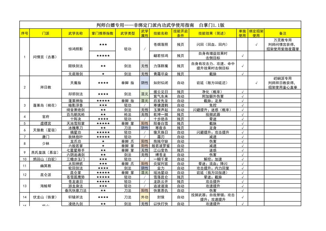 攻略负责人:杨依霜、绯村毛玉 更新了一下武学系数表的查询方式以及可查询的系数量。 链接地址:https://wiki.biligame.com/fzjh/%E6%AD%A6%E5%AD%A6%E7%B3%BB%E6%95%B0%E6%9F%A5%E8%AF%A2%E8%A1%A8 预览图: 点击武学名称与门派名称会跳到相关的详细系数页面或门派攻略: 目前可查询的系数有: 1.页面标题 2.武学名称