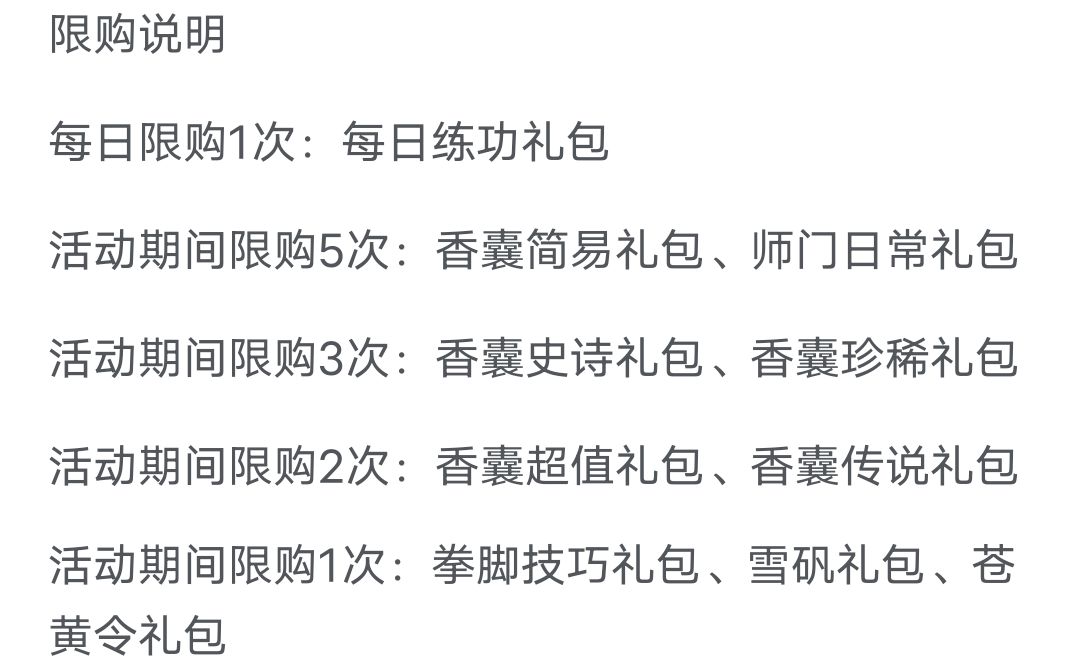 放置江湖在2024/03/27日更新后香囊密阁的礼包限购更改由之前的 更改为 因此氪金的金额也有所改变。 之前的香囊密阁第四档需要的金额为516元,更新之后仅需450元。 在每日充值福利活动中可以采取连续4天充值60元+30元礼包,第五天充值60元+5个6元礼包。