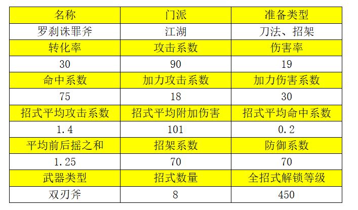 放置江湖官方攻略组: 作者:毛玉,杨依霜 编辑:罪惘生 新增武学: 新增主动技能: 简评: 新的江湖刀法,武器限制只能使用双刃斧。双刃斧是刀类神兵中平砍最强的,只是能用双刃斧的刀法武学比较少。得益于此,罗刹诛罪斧自身平砍可以和双环阴阳归一环、软剑铁血誓剑相近。而除此之外,双刃斧还有减速对方的特性,如果减速全覆盖,罗刹诛罪斧甚至可以略微压制目前平砍最强的玉心清虚剑/采薇剑法。当然实战中减速不会全覆