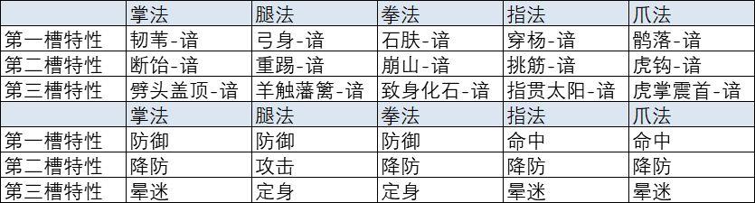 第一槽选防御,没有防御选命中。 第二槽选降防,没有降防选攻击。 第三槽选晕迷,没有晕迷选定身。 下图是五类拳脚可选择的特性及其效果。
