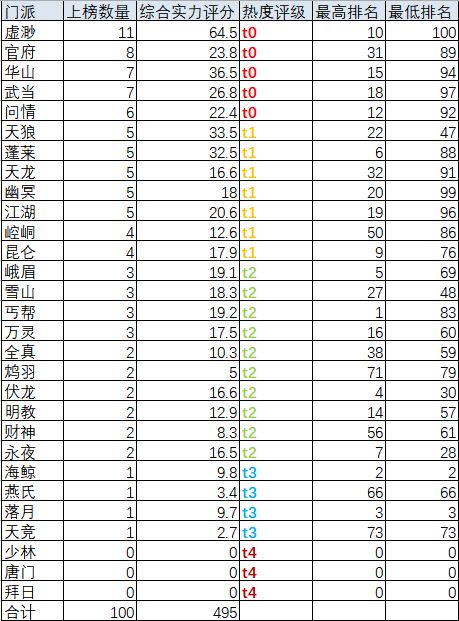 2025年3月苍松迎客服高手帮上榜侠客门派数量统计。 如图,统计于2025年3月5日晚上22点,综合实力评分是根据所有上榜侠客的排名计算得出,并不说明门派武学的强度。由表可知,上榜侠客门派数量的情况与去年相比变化较大。由于没有侠客上榜,少林,唐门,拜日三个门派的最高和最低排名都在100名以外。
