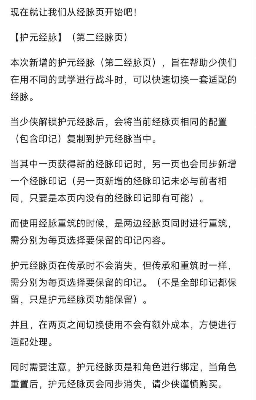 1.解锁新的经脉页会复制原有经脉天赋的内容 2.传承的时候,两页经脉页能各自保留不同的经脉天赋(对于经脉印记大家可能不是很熟悉,因为这个东西只在传承时,选要保留经脉天赋的时候出现,算是一个熟悉的新名词) 3.经脉重铸会把两页经脉天赋都重铸了,其中护元经脉里的经脉印记可以有选择性的保留 4.护元经脉页在角色重置时会消失 5.经脉页切换没有损耗 预测: 1.未来会有很多的护元经脉页可供购买,但是不知道