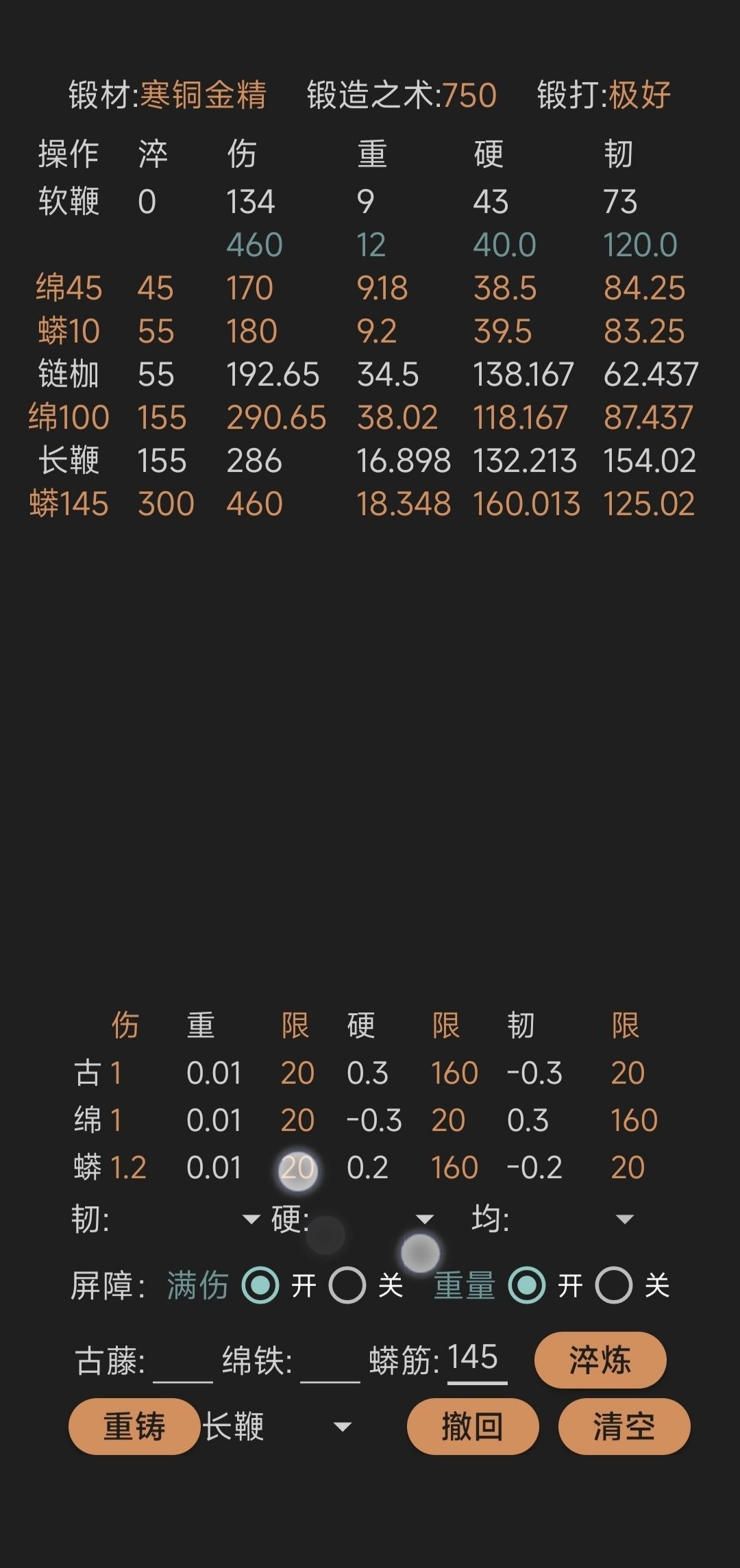 打造思路: 1.目测 380锻(极好概率的门槛) 是刚好能淬满伤害 (也不知道是不是伤害有小数,350~380加了2点伤害) 2.用 镔铁 的重要原因是 硬度初始高,淬炼时可以把硬度往上提一提 3.韧度=50 是最低要求(好像锻打 极好 的范围50-55) 因镔铁 白嫖程度极其简单(南阳) 望少侠 毅力刷出 满硬[表情_微笑] ———————— 图2是满 硬韧 的方案