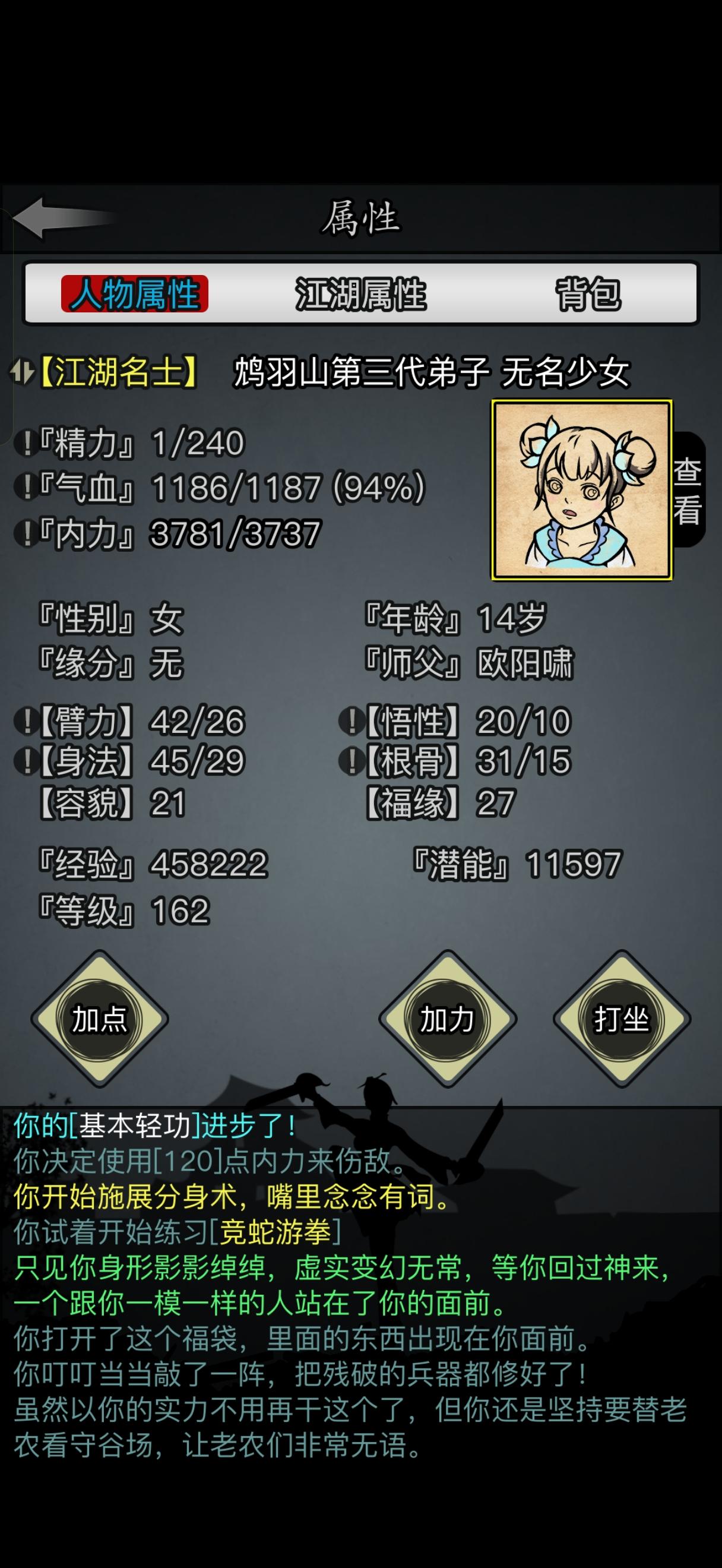 前段时间突然想要开一个新号,于是决定要不就玩一下五世散人。立此贴为起点,督促自己坚持下去!其实接触这游戏蛮久了,我是当年小程序玩家(没错,放置江湖出过小程序版本),当时玩到三转就关服了,也没要退款,而是移植到新服,后来玩了几天不想玩了就给YES了。所以,算是弥补当年的遗憾,也算是重新拾起初入江湖时的热情。零转!零氪!六世散人!从这里开始!从今天开始我会以至少三天一更新的速度发布此角色的进