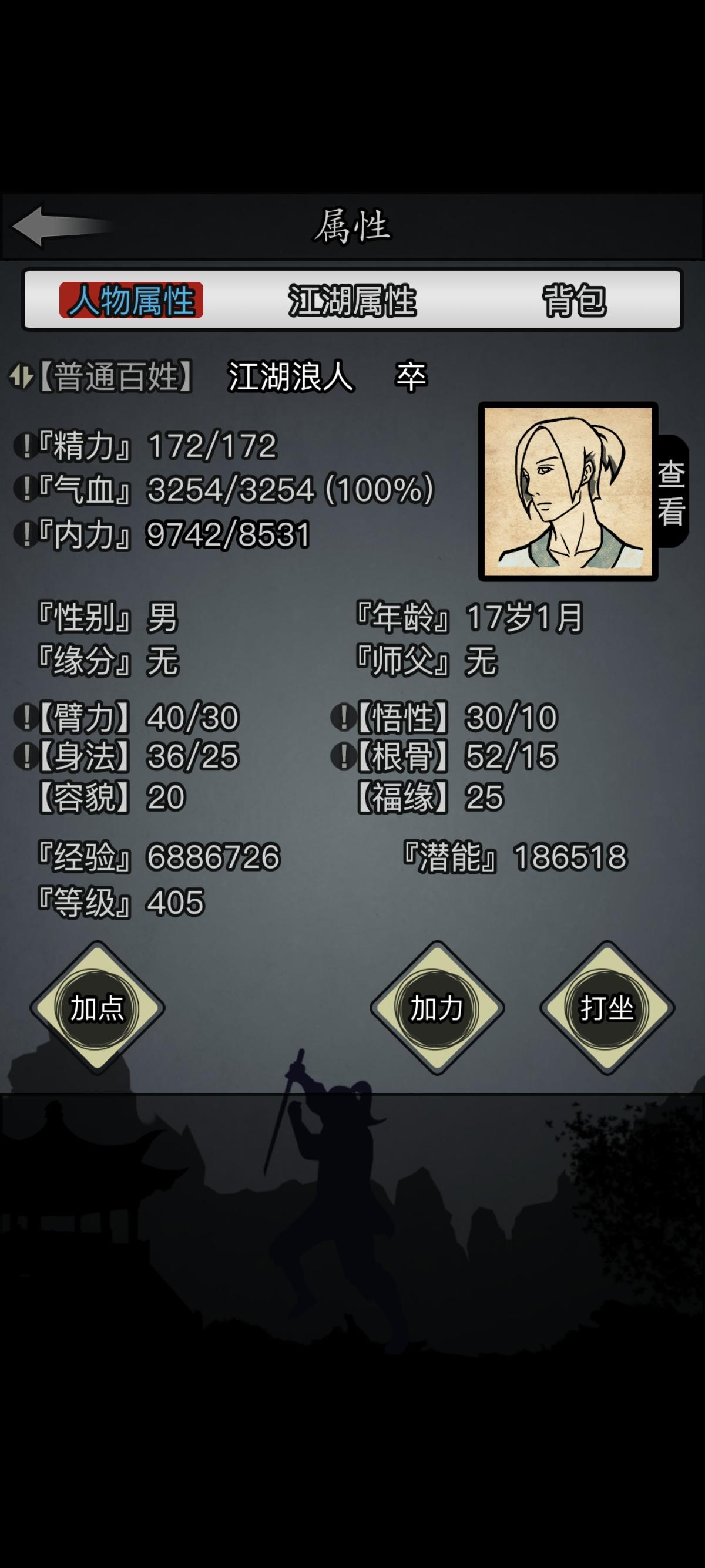前段时间突然想要开一个新号,于是决定要不就玩一下五世散人。立此贴为起点,督促自己坚持下去!其实接触这游戏蛮久了,我是当年小程序玩家(没错,放置江湖出过小程序版本),当时玩到三转就关服了,也没要退款,而是移植到新服,后来玩了几天不想玩了就给YES了。所以,算是弥补当年的遗憾,也算是重新拾起初入江湖时的热情。零转!零氪!六世散人!从这里开始!从今天开始我会以至少三天一更新的速度发布此角色的进
