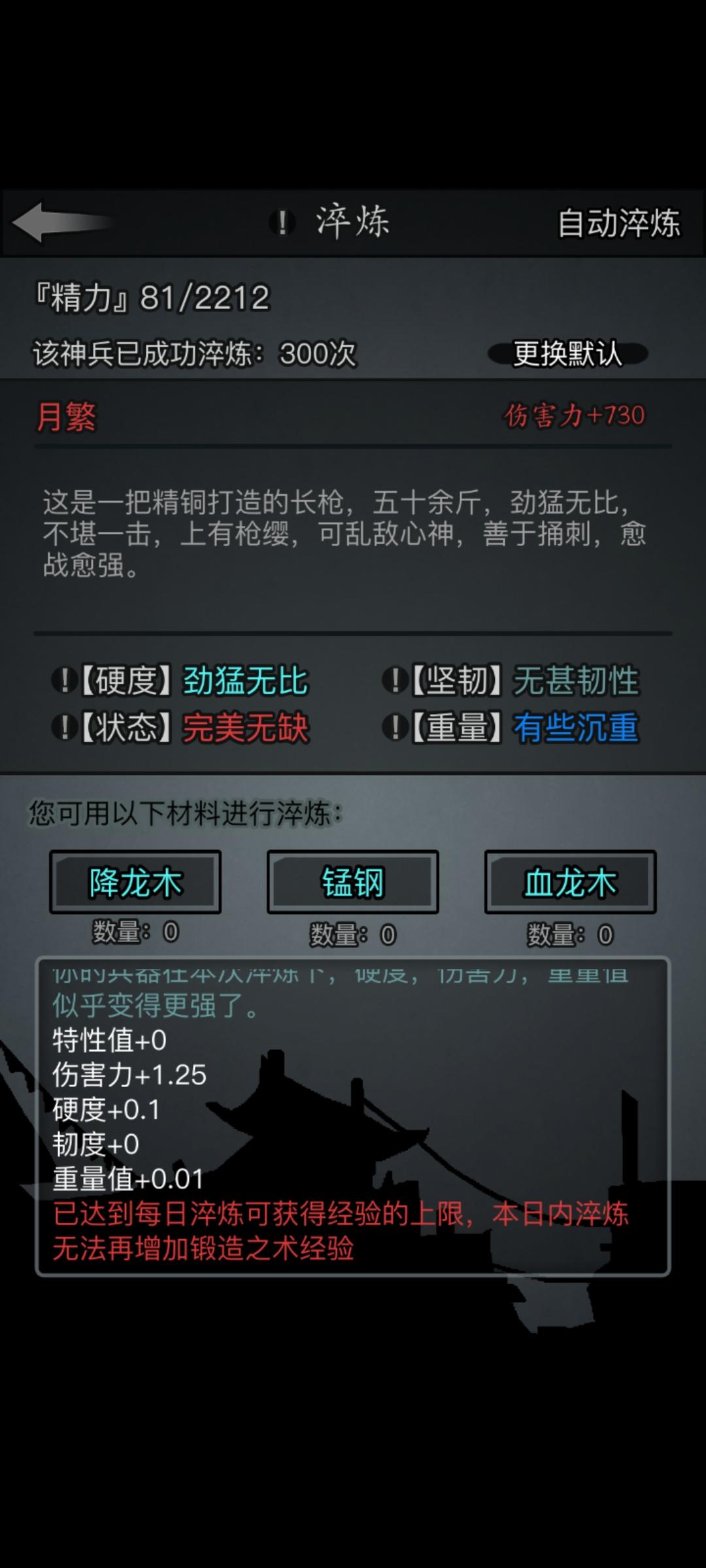 为了打把加速长枪是真拼了老命了,前一个半月陆陆续续敲到220淬,血龙木都花光了,本来想着慢慢做,到过年的时候应该能做出来,但前两天虎枪练到500级了,发现没神兵的虎枪玩得是真不爽啊!然后就一鼓作气,打了一下午加一晚上的铁,把降龙木和锰钢全换成了如意,应该有一百八十个左右,全换成血龙木去敲,敲到了290淬,钱和材料都敲没了,然后从其他武器的材料里抠,又换了三十几个材料自己拿精力敲,敲到了299淬精力