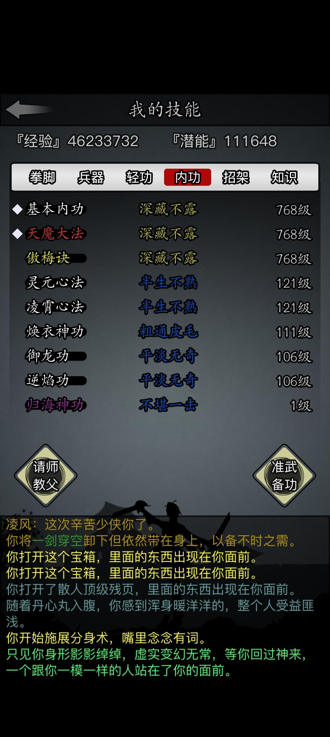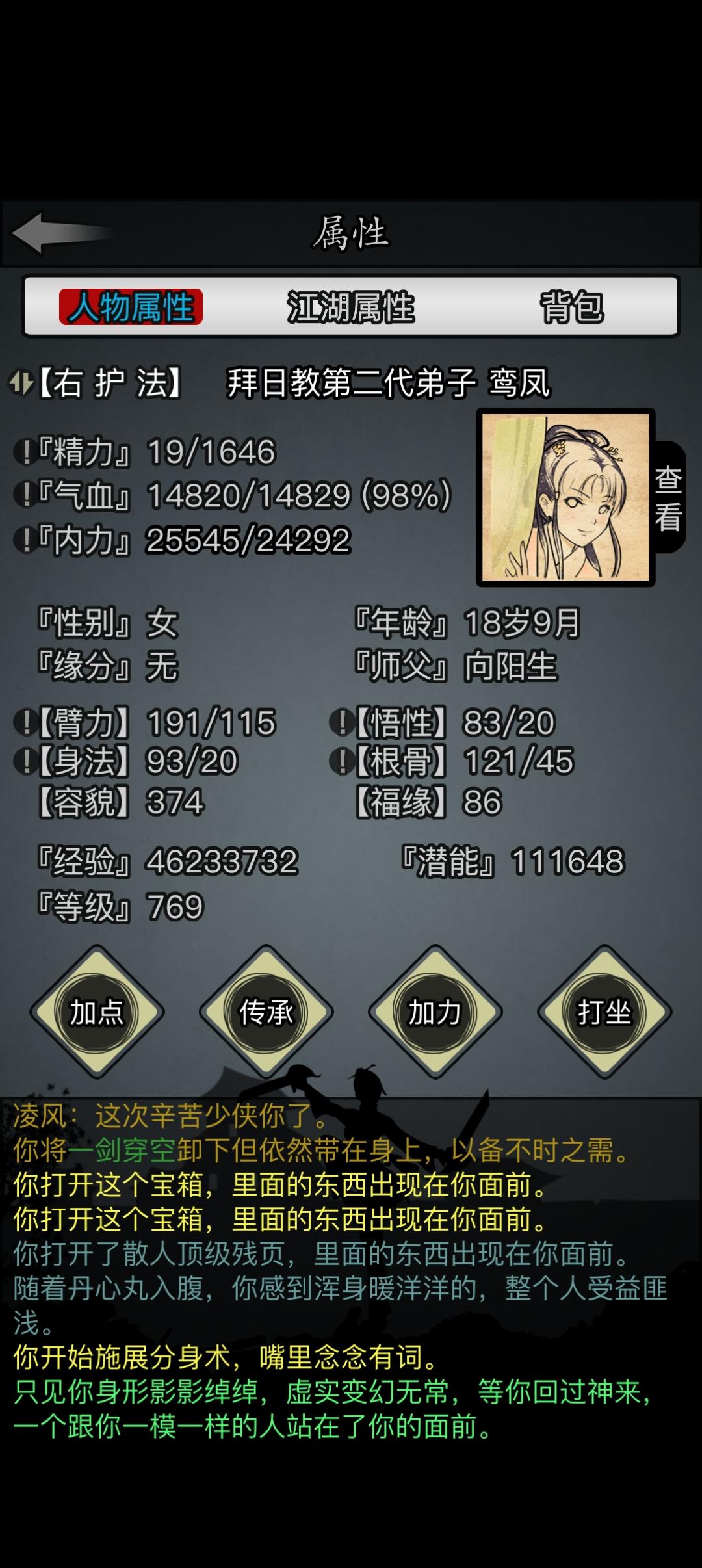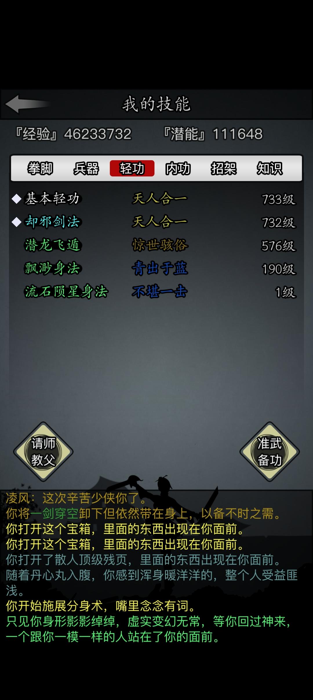 开始十几天感觉人龙不了了就摆烂了点,后面稍微算了一下发现这转还是有机会的。本来还想练个辟邪拉基础剑法等级,结果到后面冲人龙的时候发现轻功只能练这个了,不然这转到不了,遗产也只有700级潜龙,根本不够用。早知道就直接练华胥引了,好在轻功没拖很大后腿。越女剑放天都峰配上潜龙遗产,第一天打完了35,不过后几天才开始打折掌慢了几步还是比较可惜。另外再说一句,天魔解体就是爽,飞贼可以秒了打日常速度一下子就快