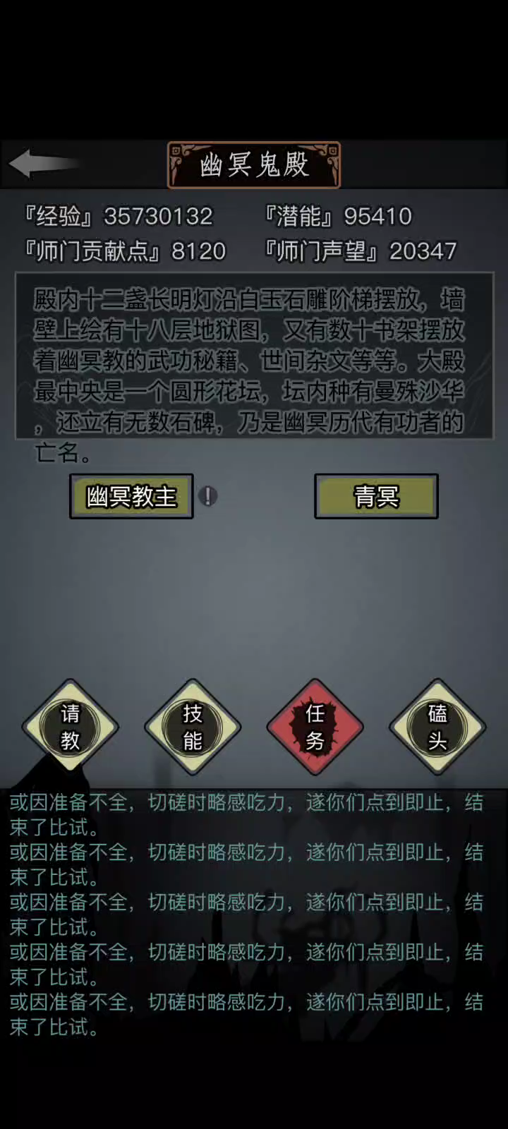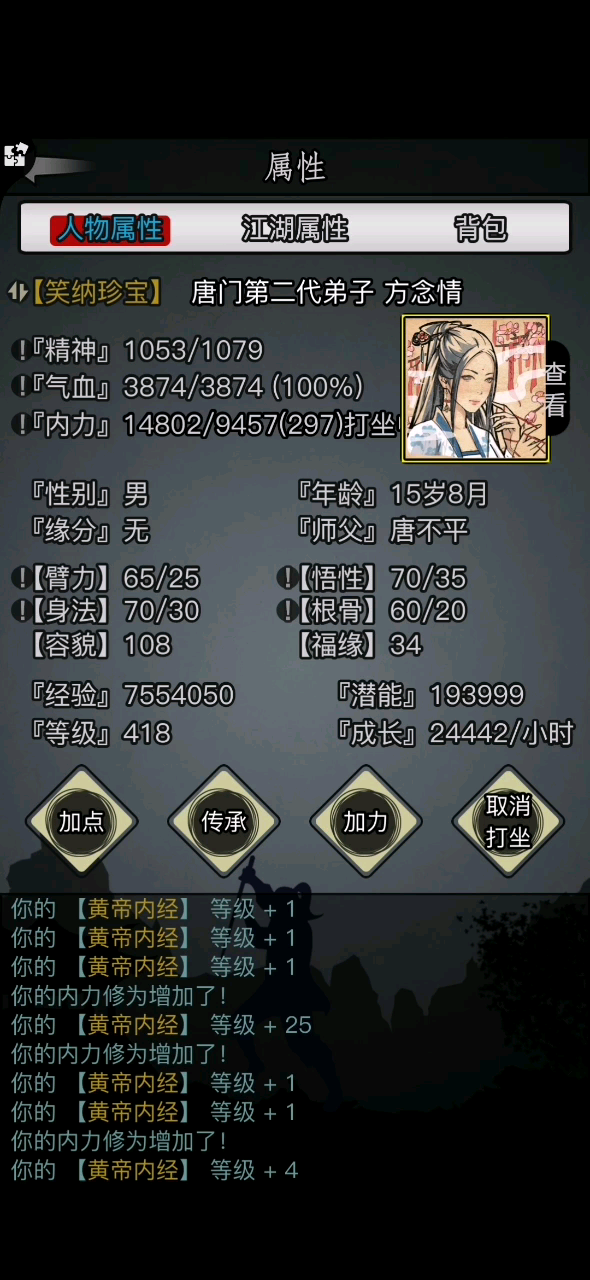 嫁衣401技能四重,琴540技能均五重,轻功用的僵尸步,臂力先天170,对面是同期,评价白字比我早传承二十天左右,可以看到伤害还是有一点的,但很明显平砍环节吃亏。这把能赢基本靠运气,正常情况是铁输的。