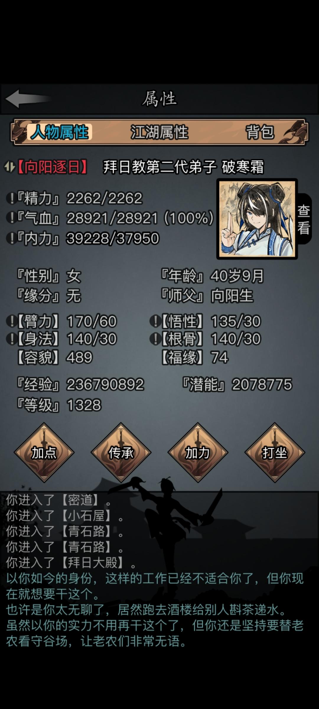 开始十几天感觉人龙不了了就摆烂了点,后面稍微算了一下发现这转还是有机会的。本来还想练个辟邪拉基础剑法等级,结果到后面冲人龙的时候发现轻功只能练这个了,不然这转到不了,遗产也只有576级潜龙,根本不够用。早知道就直接练华胥引了,好在轻功没拖很大后腿。越女剑放天都峰配上潜龙遗产,第一天打完了35,不过后几天才开始打折掌慢了几步还是比较可惜。另外再说一句,天魔解体就是爽,飞贼可以秒了打日常速度一下子就快
