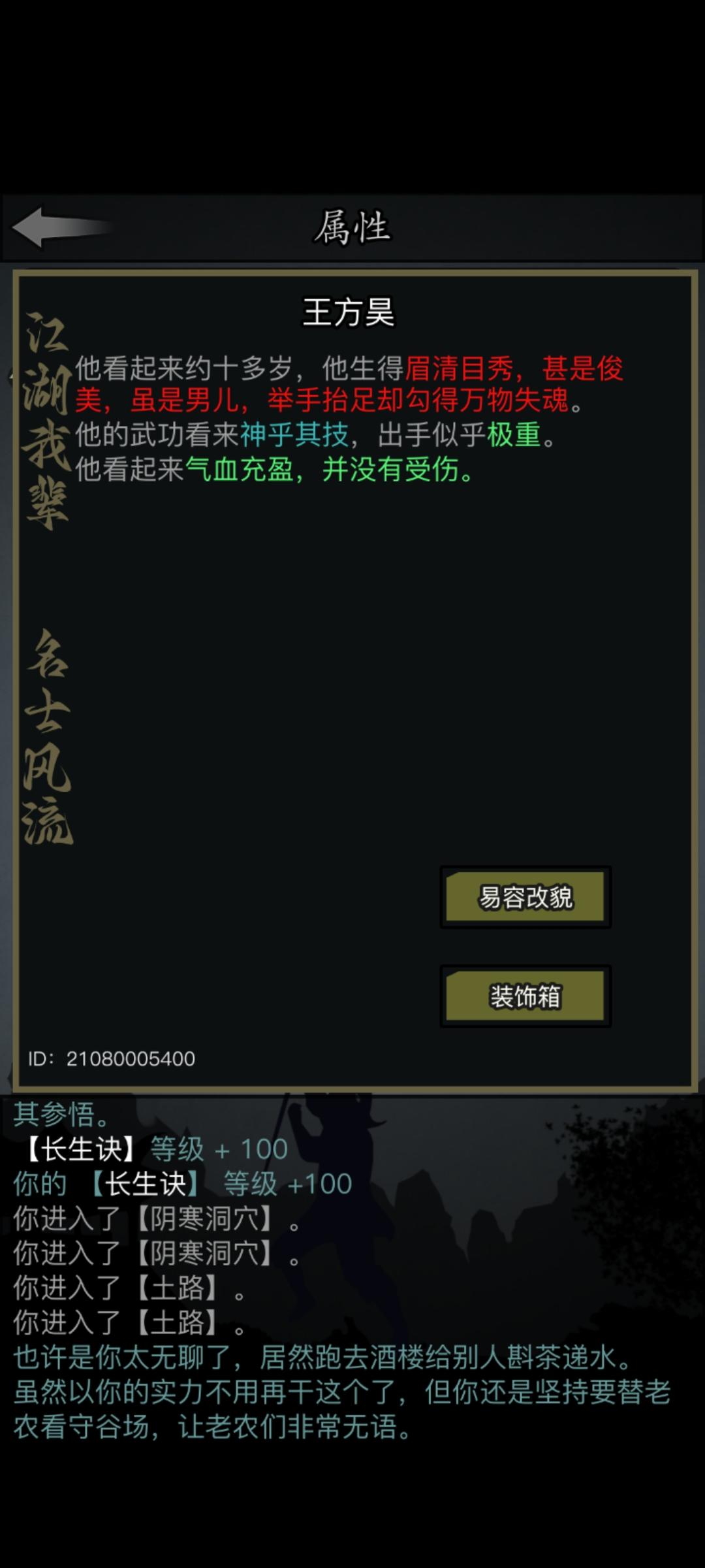 这是一期偏新手向的攻略,我会从头开始一点点解决各位少侠的问题,由于是第一次做攻略,如有任何差错,欢迎指正(参考放置江湖wiki,感谢各位前辈)附地址一、出身选择在少侠确定了性别之后,会让各位少侠选择出身很多少侠会觉得这个出身与性别相似,不会对游戏本身产生影响,等到想改的时候已经来不及了孤儿(强推)(主流)孤儿开局的优势就在于福源会比其他出身更高,福源决定了角色的挂机收益,而