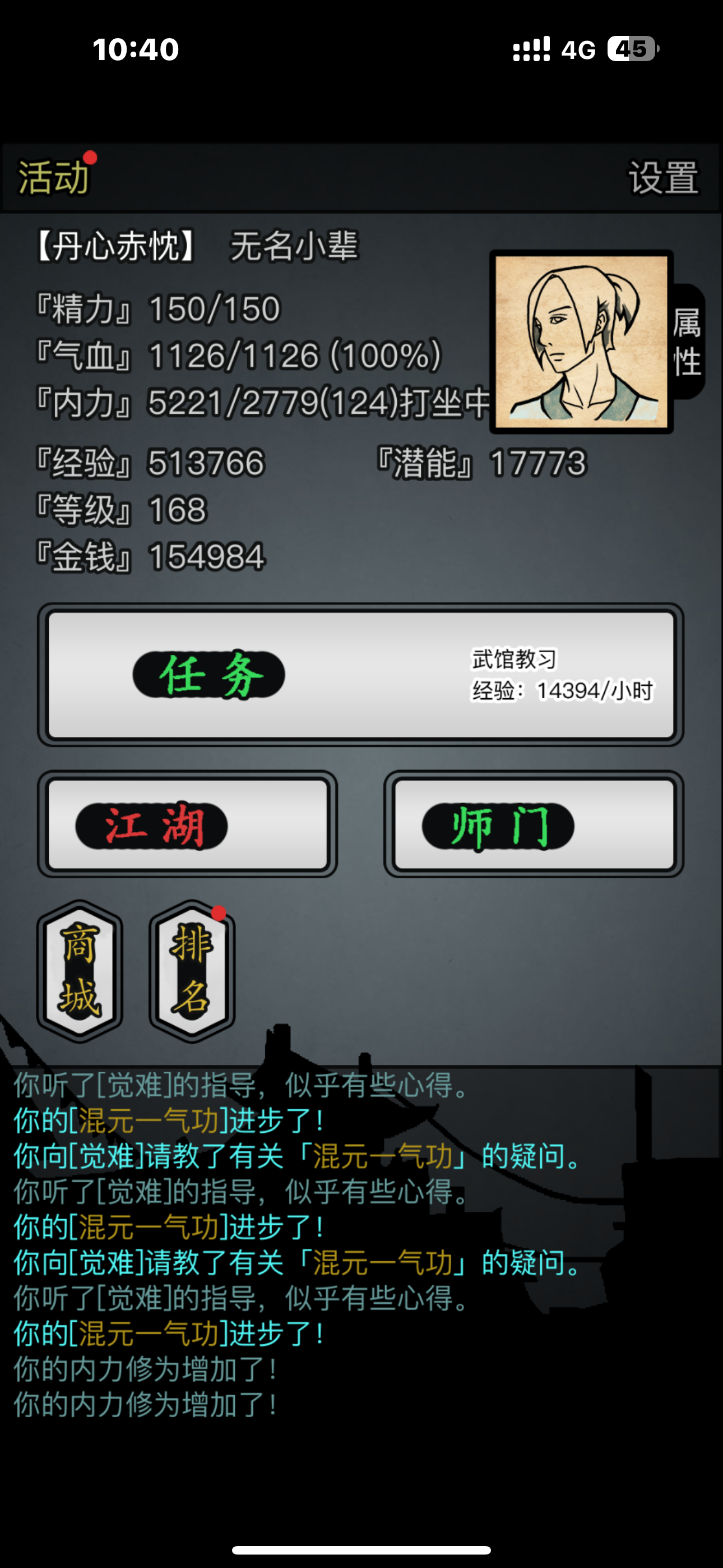 本周门派武学全部500买了垫子,开始练遗产了,目前越女太玄全部530目测还有个六七天到600级,22天左右完成传承疑问:静心丹怎么用比较合理,两组已经快用没了。