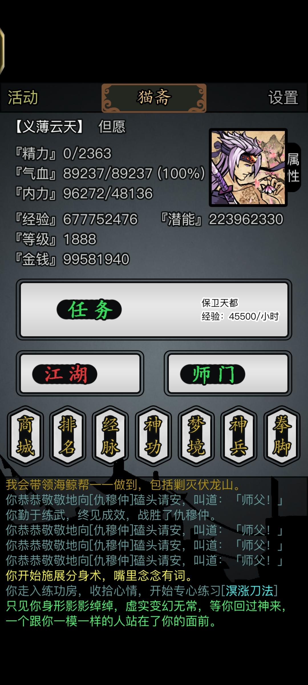 前段时间突然想要开一个新号,于是决定要不就玩一下五世散人。立此贴为起点,督促自己坚持下去!其实接触这游戏蛮久了,我是当年小程序玩家(没错,放置江湖出过小程序版本),当时玩到三转就关服了,也没要退款,而是移植到新服,后来玩了几天不想玩了就给YES了。所以,算是弥补当年的遗憾,也算是重新拾起初入江湖时的热情。零转!零氪!六世散人!从这里开始!从今天开始我会以至少三天一更新的速度发布此角色的进